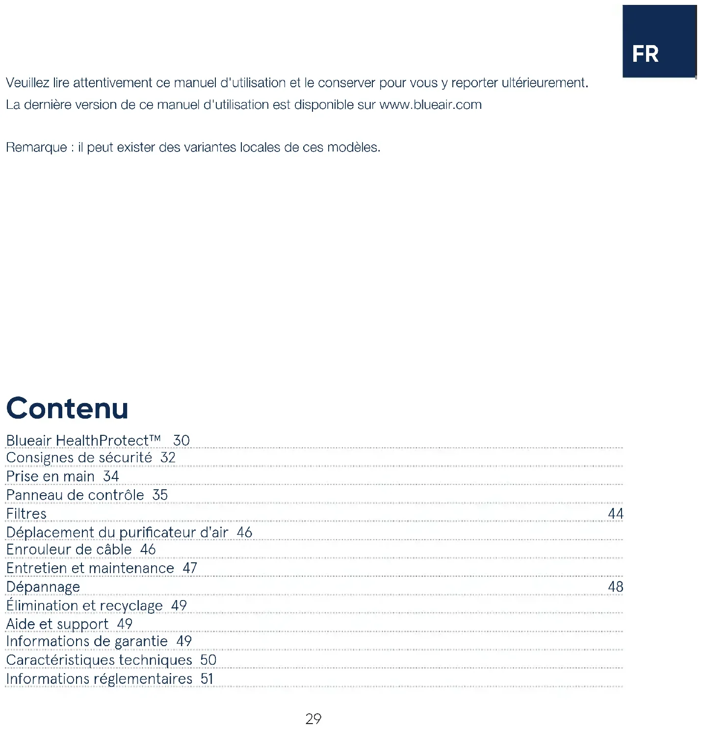 Blueair HealthProtect™ 30 Consignes de sécurité 32 Prise en main 34 Panneau de contrôle 35 Filtres 44 Déplacement du purificateur d'air 46 Enrouleur de câble 46 Entretien et maintenance 47 Dépannage 48 Élimination et recyclage 49 Aide et support 49 Informations de garantie 49 Caractéristiques techniques 50 Informations réglementaires 51 Contenu Veuillez lire attentivement ce manuel d'utilisation et le conserver pour vous y reporter ultérieurement. La dernière version de ce manuel d'utilisation est disponible sur www.blueair.com Remarque: il peut exister des variantes locales de ces modèles. FR30 Blueair HealthProtect™ Les purificateurs d'air Blueair HealthProtect™ sont proposés en trois modèles : les modèles 10, les modèles 40 et les modèles 70. Tous les modèles sont compatibles Wi-Fi, ont une fonction GermShield