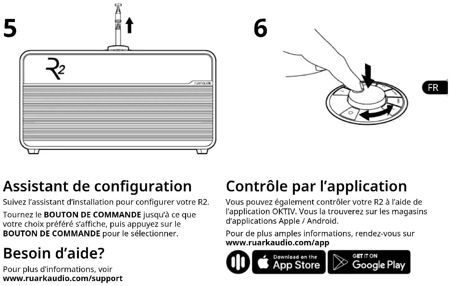 Assistant de conguration Suivez l’assistant d’installation pour congurer votre R2. Tournez le BOUTON DE COMMANDE jusqu’à ce que votre choix préféré s’ache, puis appuyez sur le BOUTON DE COMMANDE pour le sélectionner. Besoin d’aide? Pour plus d’informations, voir www.ruarkaudio.com/support Contrôle par l’application Vous pouvez également contrôler votre R2 à l’aide de l’application OKTIV. Vous la trouverez sur les magasins d’applications Apple / Android. Pour de plus amples informations, rendez-vous sur www.ruarkaudio.com/appConseils Vous pouvez également appuyer sur