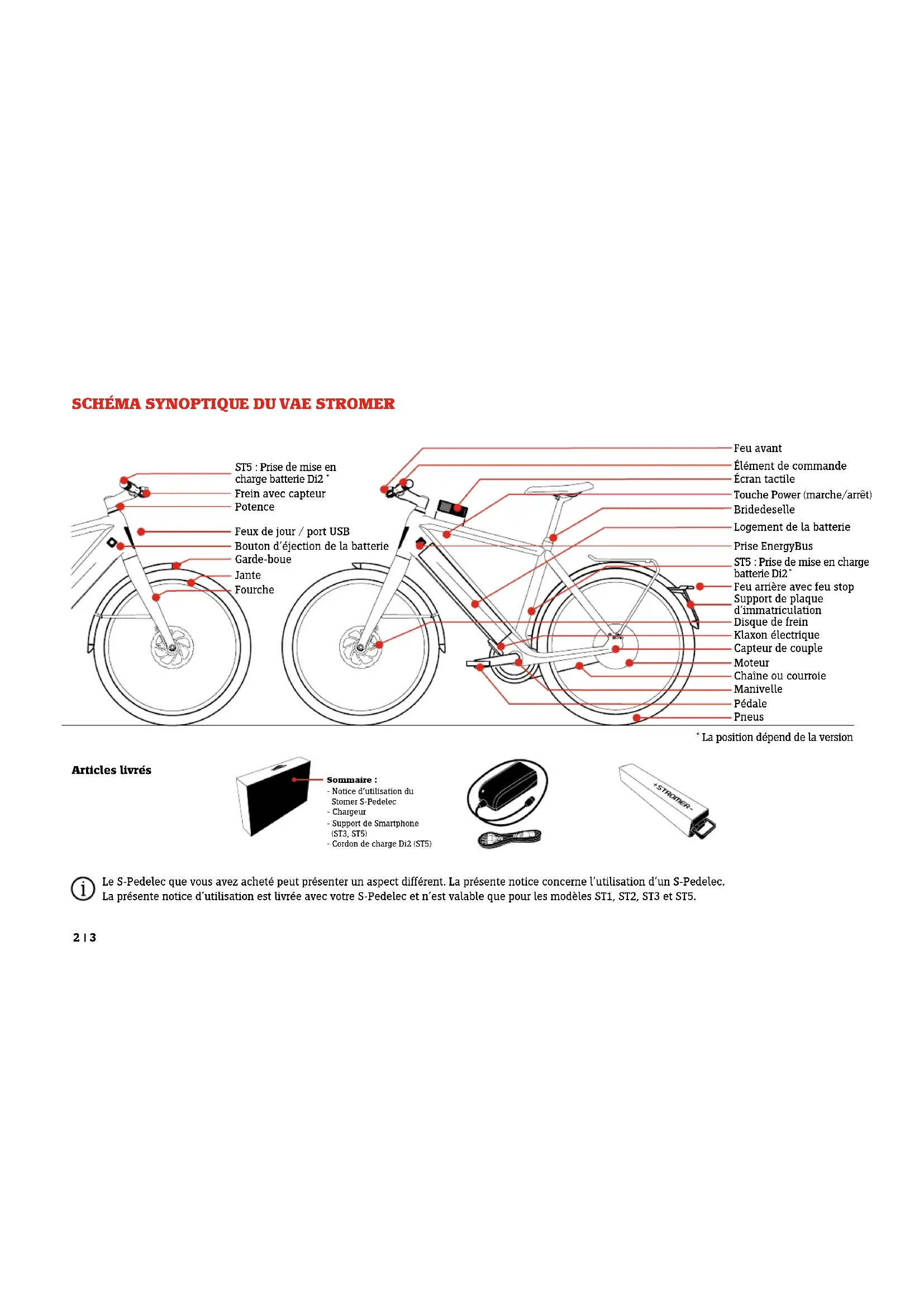 Articles livrés Frein avec capteur Feux de jour / port USB Bouton d’éjection de la batterie Feu avant Élément de commande Écran tactile Touche Power (marche/arrêt) Prise EnergyBus Feu arrière avec feu stop Logement de la batterie Support de plaque d’immatriculation Capteur de couple Moteur Pédale Pneus Garde-boue Manivelle Bride de selle Potence Disque de frein Jante Fourche Le S-Pedelec que vous avez acheté peut présenter un aspect différent. La présente notice concerne l’utilisation d’un S-Pedelec. La présente notice d’utilisation est livrée avec votre S-Pedelec et n’est valable que pour les modèles ST1, ST2, ST3 et ST5. Sommaire : - Notice d’utilisation du Stomer S-Pedelec - Chargeur - Support de Smartphone (ST3, ST5) - Cordon de charge Di2 (ST5) ST5 : Prise de mise en charge batterie Di2 * Klaxon électrique ST5 : Prise de mise en charge batterie Di2 *