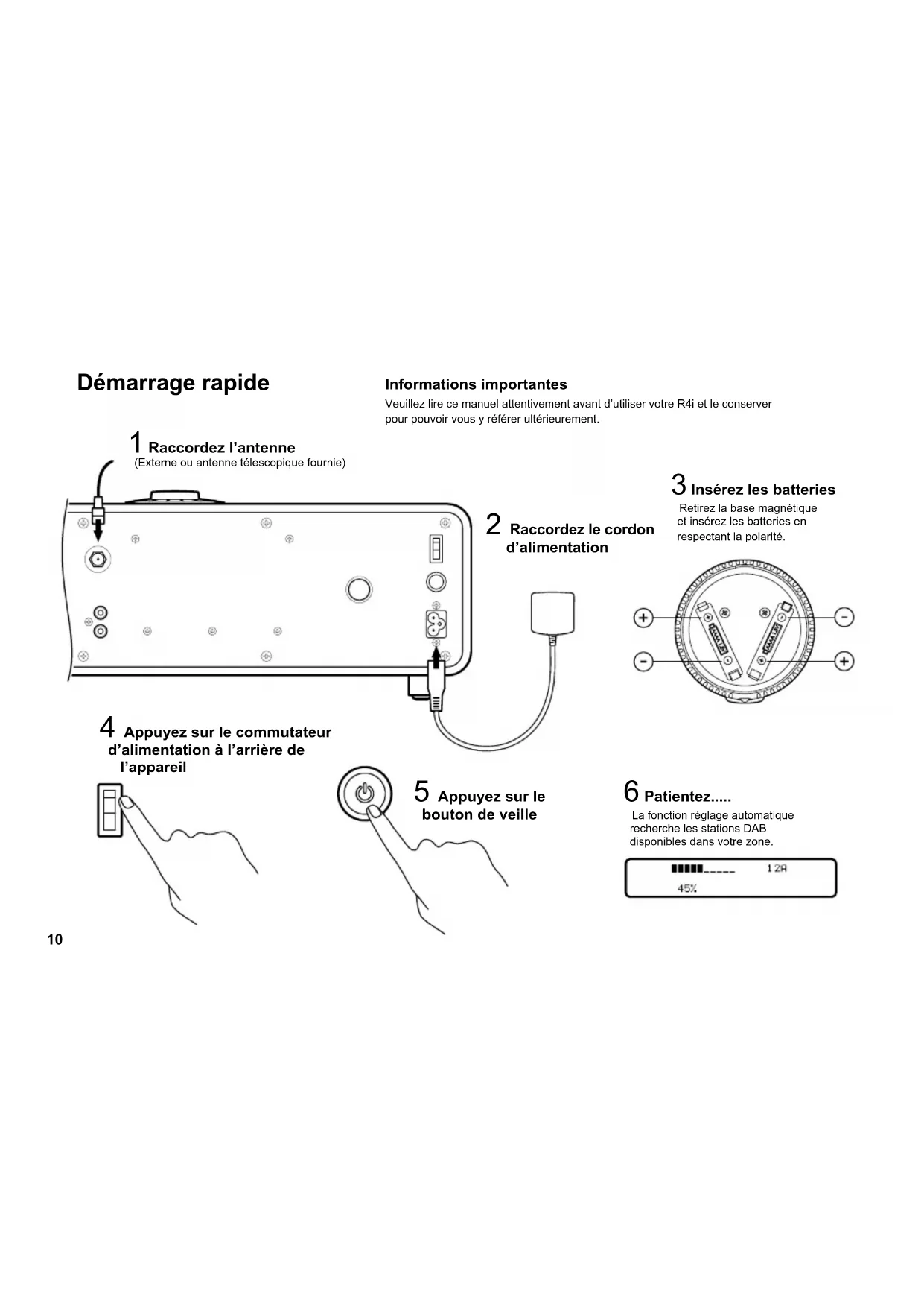 NL10 Démarrage rapide Informations importantes Veuillez lire ce manuel attentivement avant d’utiliser votre R4i et le conserver pour pouvoir vous y référer ultérieurement. 1 Raccordez l’antenne (Externe ou antenne télescopique fournie) 2 Raccordez le cordon d’alimentation 4 Appuyez sur le commutateur d’alimentation à l’arrière de l’appareil 5 Appuyez sur le bouton de veille 6 Patientez..... La fonction réglage automatique recherche les stations DAB disponibles dans votre zone. 3 Insérez les batteries Retirez la base magnétique et insérez les batteries en respectant la polarité.11 7 Écoutez..... Sélectionnez d’abord la source de votre choix ..... une cléf USB Insérez une cléf USB dans le connecteur. Le R4i recherchera les chiers musicaux MP3 / WMA et lancera automatiquement la lecture une fois le périphérique chargé. ..... un CD Lorsque vous insérez un CD dans le compartiment, l’appareil sélectionne automatiquement le lecteur de CD comme source. La lecture du CD démarre automatiquement une fois le CD chargé. ..... la radio DAB : appuyez sur ▲▼ pour faire déler les stations disponibles. OK pour sélectionner une station. FM : maintenez enfoncées les touches ▲▼ pour rechercher la station suivante. ..... un iPod Retirez le cache et insérez le cas échéant un adaptateur universel de station d’accueil iPod adapté à votre modèle, qui vous fournira un alignement correct et évitera toute tension sur le connecteur. Si vous ne disposez pas d’un adaptateur universel de station d’accueil iPod adapté à votre modèle, vous pouvez vous en procurer un directement auprès d’Apple ou de divers revendeurs Apple. Vous pouvez utiliser votre iPod avec le R4i sans adaptateur, mais vous devez dans ce cas faire particulièrement attention lors de l’insertion et du retrait. FR12 Audio Appuyez sur AUDIO pour faire déler les réglages (3D Sound [Son 3 D], Loudness [Intensité sonore], EQ [Égaliseur]). Les options modiables clignoteront. Utilisez les touches ▲▼ pour changer. OK pour conrmer. Horloge Appuyez sur CLOCK pour faire déler les différentes options : Alarm (Réveil), Sleep (Sommeil) et Manual Clock Set (Réglage manuel de l’horloge). Régler le réveil Sélectionnez Alarm, appuyez sur OK – ON/OFF clignotera. Utilisez les touches ▲▼ et OK pour dénir l’heure du réveil, la source et le volume. Une fois le réglage effectué, l’écran se “désactive” au bout de 5 secondes. sur l’écran indique que le réveil est réglé. Régler la fonction sommeil Sélectionnez Sleep, appuyez sur OK. ON/OFF clignotera. Utilisez les touches ▲▼ et OK pour régler la minuterie. Une fois le réglage effectué, l’écran se “désactive” au bout de 5 secondes. Un “S” indique que la fonction sommeil est active. Réglage manuel de l’horloge Utilisez cette fonction pour régler l’heure si vous vous trouvez dans une zone où le R4i ne peut recevoir automatiquement des données concernant l’heure depuis les ondes DAB ou FM avec services RDS. Afcher les réglages du réveil Appuyez brièvement sur CLOCK Activer/Désactiver le réveil Appuyez brièvement sur CLOCK Maintenez enfoncée la touche OK Standby (Veille) – appuyez pour mettre en marche/arrêt.Volume – faites pivoter vers la gauche ou vers la droite.Snooze (Répétition du réveil) – appuyer lorsque le réveil se déclenche an d’activer une minuterie de 5 minutesCancel alarm (Annulation du réveil) – appuyez sur la touche et maintenez-la enfoncée. Info Appuyez sur INFO pour faire déler les informations à l’écran. Mode DAB ● Détails sur le programme / Artiste / nom de la piste ● Puissance du signal ● Bande et fréquence ● Type de programme – par ex. Classique, Pop ● Type de diffusion et taux de transfert de données ● Nom multiplex ● Heure et date Mode FM ● Texte radio – détails sur le programme ● Puissance du signal ● Type de musique – par ex. Classique, Pop ● Mode audio – Auto (stéréo) / Mono ● Nom de la station ● Heure et date Source Appuyez sur SOURCE (la source en cours clignotera) puis utilisez les touches ▲▼ pour faire déler les différentes options : DAB, FM, CD, USB, AUX, iPod. Appuyez sur OK pour sélectionner. Télécommande Préréglages Radio Mémoriser 5 stations DAB et 5 stations FM Sélectionner une station préréglée – appuyez sur 1-5. Mémoriser une station – maintenez enfoncées les touches 1-5.13 Down (bas) iPod - Navigation dans le menuCD/USB (MP3) - Album précédent Shufe (lecture aléatoire) iPod - Lecture aléatoire des pistesCD/USB - Répéter 1/Tout répéter/Lecture aléatoire. Commandes iPod, CD et USB Enter (entrée) iPod - Navigation dans le menu Up (haut) iPod - Navigation dans le menu CD/USB (MP3) - Album suivant Info CD/USB (MP3) - Information sur l’album / la piste Lecture / mise en pause de la piste (Appuyer une fois) Arrêt (Maintenir enfoncé) MENU iPod menu navigation Menu iPod - Navigation dans le menuiPod/CD/ USBPiste suivante (Appuyer une fois) Avance rapide (Maintenir enfoncé)iPod/CD/ USBPiste précédente (Appuyer une fois)Retour rapide (Maintenir enfoncé) FR14 Familiarisation avec votre R4i Sortie (R) (L) Raccordez un amplicateur externe ou un dispositif d’enregistrement Entrée (R) (L) Raccordez une source externe par ex. un lecteur MP3 Volume intermédiaire Réglage en position médiane recommandé Connecteur d’antenne Commutateur d’alimentation Fusible T2.0A 230V 50Hz 0,75A Connecteur d’alimentation Lecture à partir d’une cléf USB Prise pour casque 3,5 mm Entrée de ligne auxiliaire Raccordez une source externe par ex. un lecteur MP3 Éjection du CD Support de télécommande T2.0A POWER 230V 50Hz 0.75A