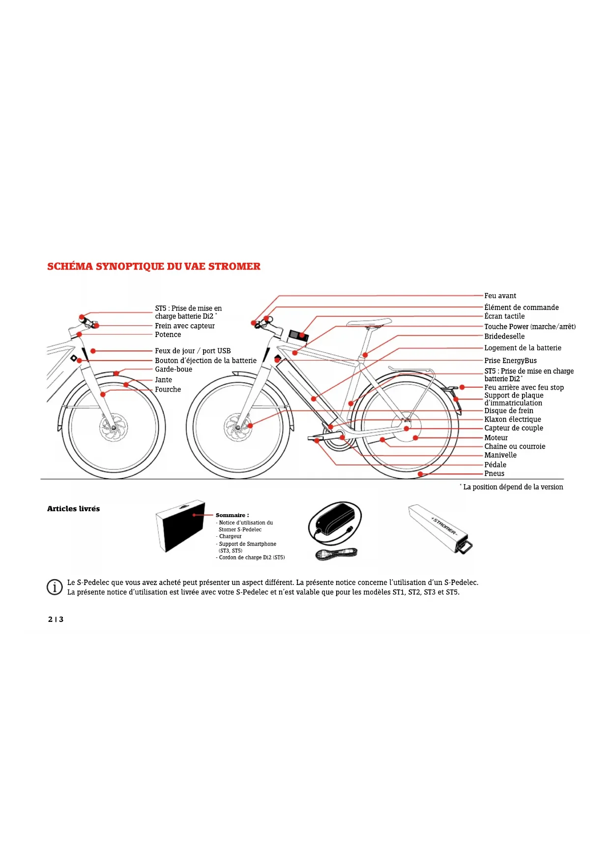Articles livrés Frein avec capteur Feux de jour / port USB Bouton d’éjection de la batterie Feu avant Élément de commande Écran tactile Touche Power (marche/arrêt) Prise EnergyBus Feu arrière avec feu stop Logement de la batterie Support de plaque d’immatriculation Capteur de couple Moteur Pédale Pneus Garde-boue Manivelle Bride de selle Potence Disque de frein Jante Fourche Le S-Pedelec que vous avez acheté peut présenter un aspect différent. La présente notice concerne l’utilisation d’un S-Pedelec. La présente notice d’utilisation est livrée avec votre S-Pedelec et n’est valable que pour les modèles ST1, ST2, ST3 et ST5. Sommaire : - Notice d’utilisation du Stomer S-Pedelec - Chargeur - Support de Smartphone (ST3, ST5) - Cordon de charge Di2 (ST5) ST5 : Prise de mise en charge batterie Di2 * Klaxon électrique ST5 : Prise de mise en charge batterie Di2 *