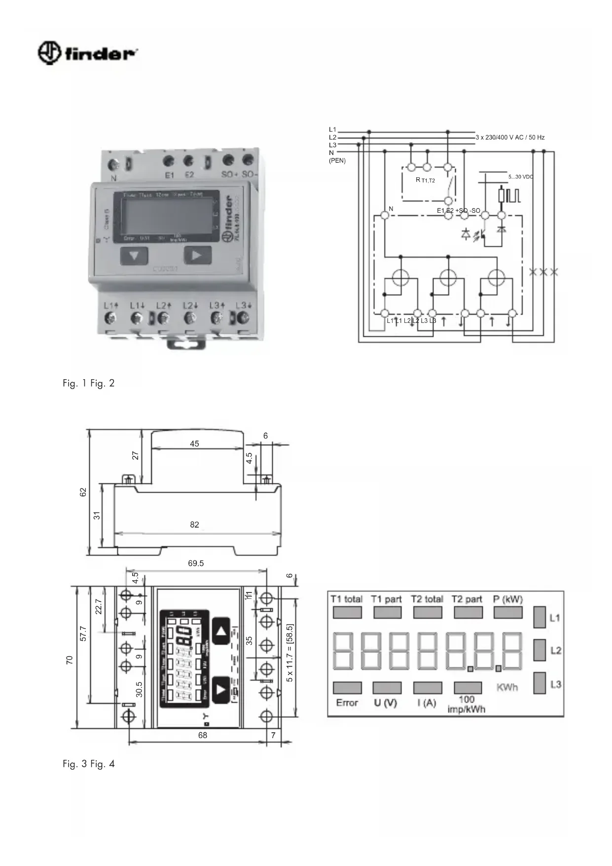 No caso de uma fase que falta ou sentido de corrente errado. A respectiva fase é indicada adicionalmente.FINDER SpA Via Drubiaglio, 14 10040 Almese (TO) - ITALY Francais 4 319 5085 0a 01.2010 Sous réserve de modifications sans préavis Instructions de montage et d’exploitation, Type 7E.46 Compteur d’énergie active 65A triphasé, Fig.1 Description L’7E.46 est un compteur compact électronique de puis- sance active pour l’utilisation dans les réseaux triphasés avec neutre. L’écran LCD très lisible affiche en fonction du modèle des valeurs supplémentaires telles que la puissance momentanée totale ou par phase, ainsi que les tensions et courants par phase. Caractéristiques techniques Schéma de