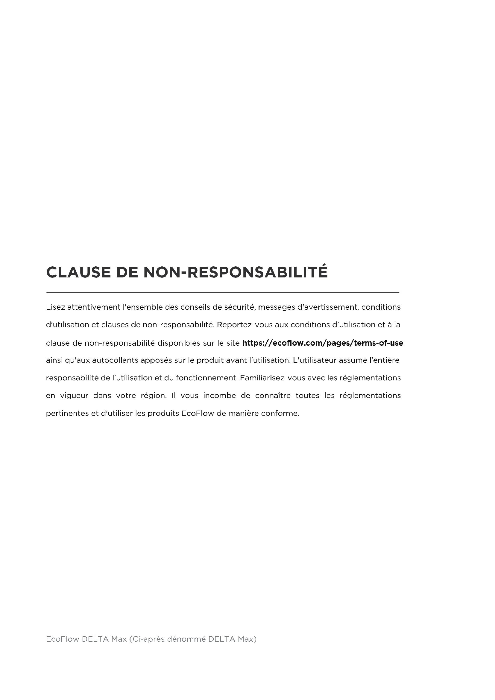 L'application EcoFlow permet aux utilisateurs de contrôler et de surveiller les centrales EcoFlow à distance. Consultez le manuel d'utilisation de l'application EcoFlow et accédez au lien de téléchargement à l'adresse suivante: https://eu.ecoflow.com/pages/ download-center. Le produit peut être connecté à un maximum de deux batteries supplémentaires intelligentes en même temps pour répondre à des besoins de capacité plus élevés. Reportez-vous aux manuels d'utilisation de la batterie supplémentaire intelligente DELTAMax et du Smart Generator pour obtenir des instructions détaillées. Politique de confidentialité En utilisant les produits, les applications et les services EcoFlow, vous acceptez les conditions d'utilisation et la politique de confidentialité d'EcoFlow, que vous pouvez consulter via la section «À propos» de la page «Utilisateur» de l'application EcoFlow ou sur le site officiel d'EcoFlow aux adresses https:// ecoflow.com/pages/terms-of-use et https://ecoflow.com/pages/privacy-policy. Avant d'utiliser la batterie supplémentaire, veuillez suivre les instructions ci-dessous: