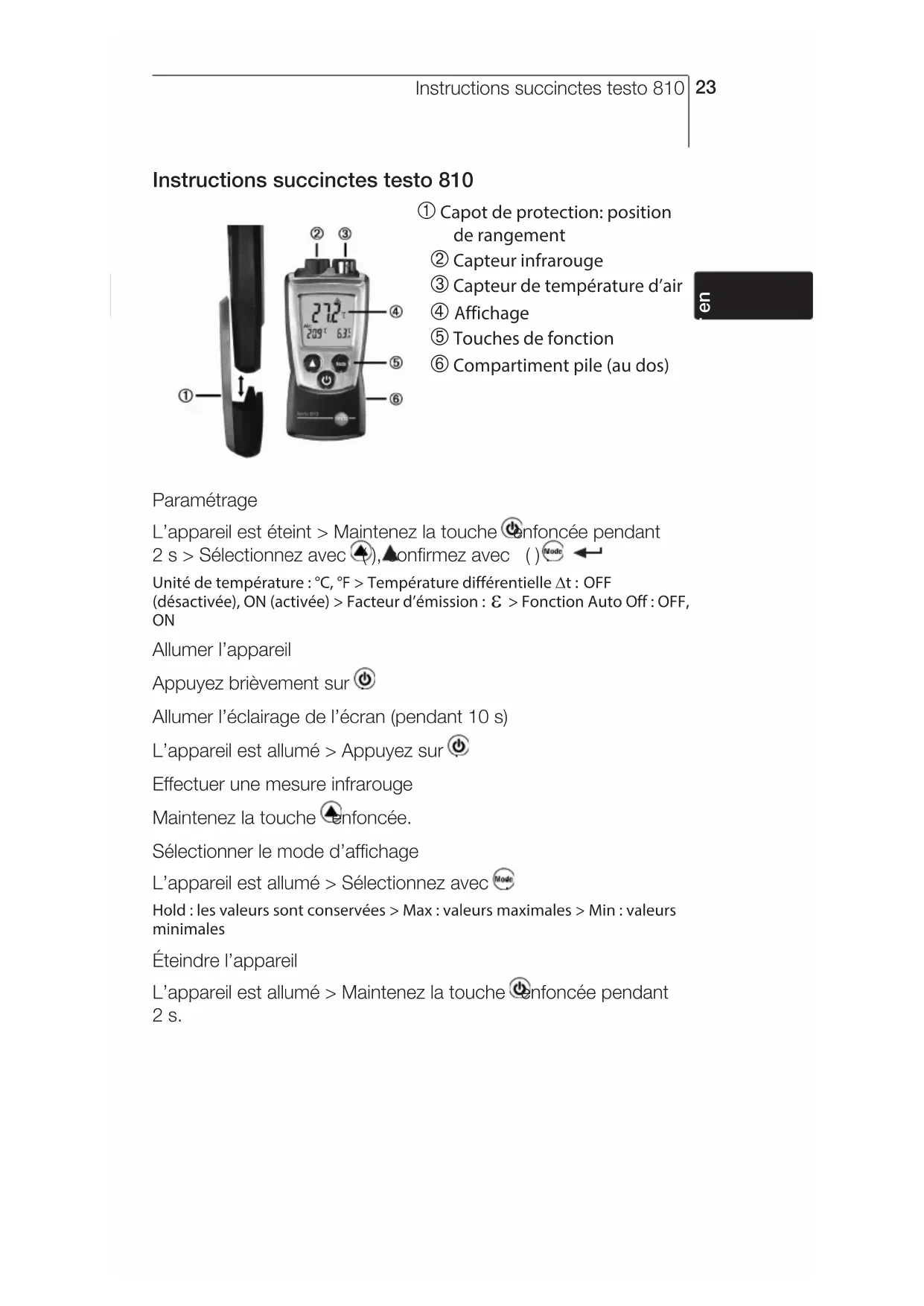 Instructions succinctes testo 810 À Capot de protection: position de rangement Á Capteur infrarouge  Capteur de température d’air à Affichage Ä Touches de fonction Å Compartiment pile (au dos) Paramétrage L’appareil est éteint > Maintenez la touche enfoncée pendant 2 s > Sélectionnez avec ( ), confirmez avec ( ) : Unité de température : °C, °F > Température différentielle Dt : OFF (désactivée), ON (activée) > Facteur d’émission : e > Fonction Auto Off : OFF,