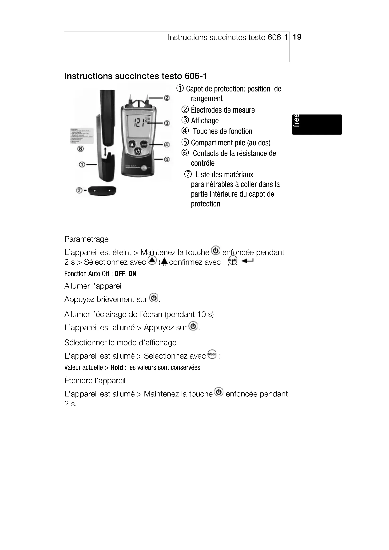 Tips and assistance19 Instructions succinctes testo 606-1 À Capot de protection: position de rangement Á Électrodes de mesure  Affichage à Touches de fonction Ä Compartiment pile (au dos) Å Contacts de la résistance de contrôle ÆListe des matériaux paramétrables à coller dans la partie intérieure du capot de protection Paramétrage L’appareil est éteint > Maintenez la touche enfoncée pendant 2 s > Sélectionnez avec ( ), confirmez avec ( ) : Fonction Auto Off : OFF, ON Allumer l’appareil Appuyez brièvement sur