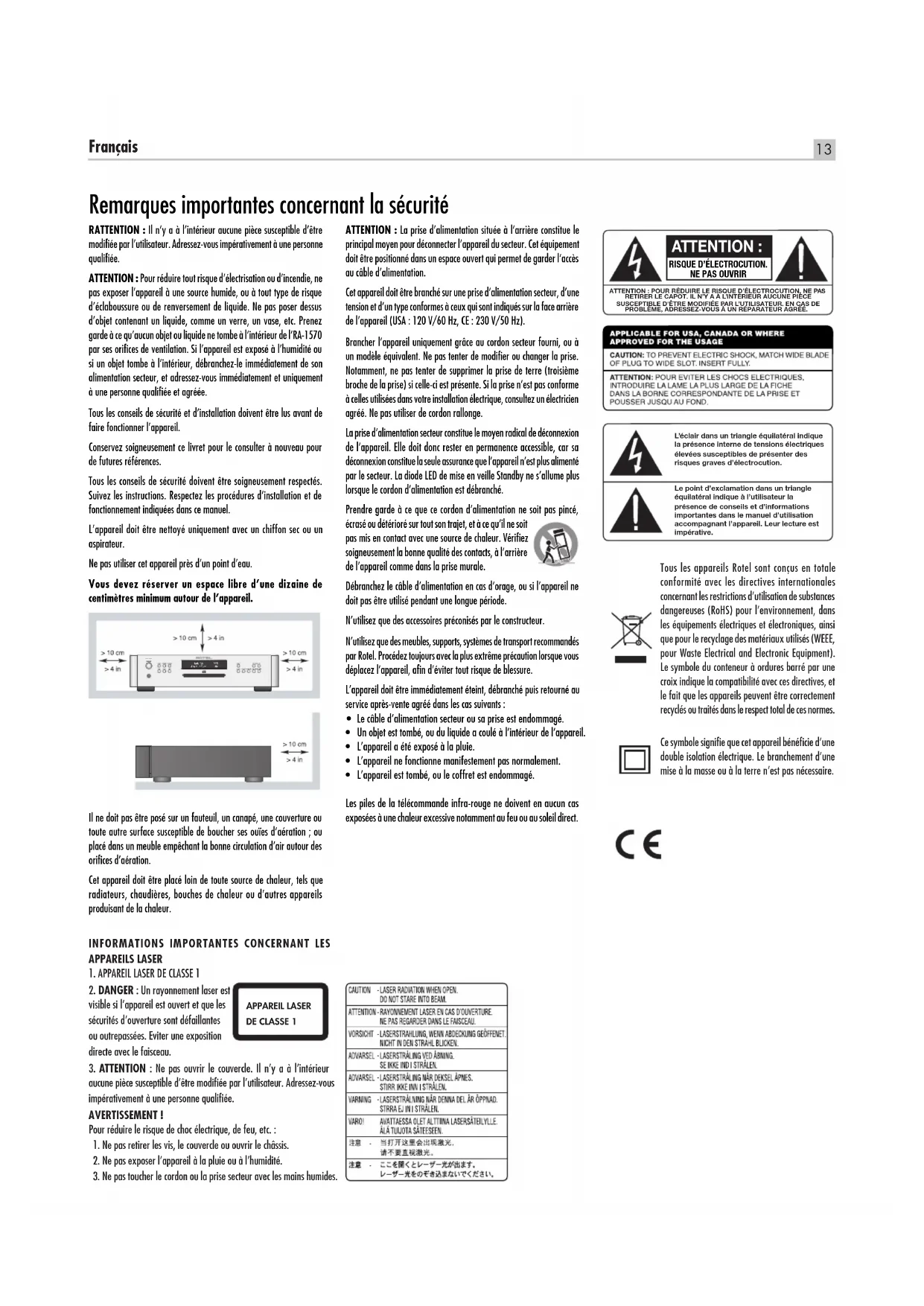- L’appareil est tombé, ou le coffret est endommagé. Les piles de la télécommande infra-rouge ne doivent en aucun cas exposées à une chaleur excessive notamment au feu ou au soleil direct. RCD-1570 ATTENTION : RISQUE D’ÉLECTROCUTION. NE PAS OUVRIRATTENTION : POUR RÉDUIRE LE RISQUE D’ÉLECTROCUTION, NE PAS RETIRER LE CAPOT. IL N’Y A À L’INTÉRIEUR AUCUNE PIÈCE SUSCEPTIBLE D'ÊTRE MODIFIÉE PAR L’UTILISATEUR. EN CAS DE PROBLÈME, ADRESSEZ-VOUS À UN RÉPARATEUR AGRÉÉ.L’éclair dans un triangle équilatéral indique la présence interne de tensions électriques élevées susceptibles de présenter des risques graves d’électrocution.Le point d’exclamation dans un triangle équilatéral indique à l’utilisateur la présence de conseils et d’informations importantes dans le manuel d’utilisation accompagnant l’appareil. Leur lecture est impérative.14 RCD-1570 Lecteur de disques compacts stéréo Sommaire Figure 1: Commandes et Branchements 3 Figure 2: Télécommande RR-D98 3 Figure 3: Sorties analogiques et branchements trigger 12 V IN 4 Figure 4: Sorties symétriques 4 Figure 5: Sortie numérique 5 Remarques importantes 6 Remarques importantes concernant la sécurité ............................13 A propos de Rotel .................................................14 A propos du RCD-1570. . . . . . . . . . . . . . . . . . . . . . . . . . . . . . . . . . . . . . . . . . . . . . 14 Mise en route ....................................................15 Quelques précautions préalables 15 Installation 23 Repérages des éléments 15 Alimentation secteur et commandes .....................................15 Prise secteur