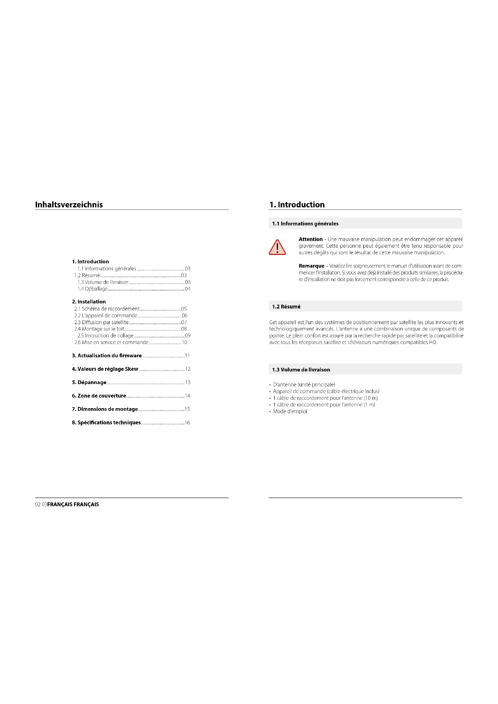 Attention - Une mauvaise manipulation peut endommager cet appareil gravement. Cette personne peut également être tenu responsable pour autres dégâts qui sont le résultat de cette mauvaise manipulation. Remarque – Veuillez lire soigneusement le manuel d’utilisation avant de com- mencer l’installation. Si vous avez déjà installé des produits similaires, la procédu- re d’installation ne doit pas forcement correspondre à celle de ce produit. Cet appareil est l‘un des systèmes de positionnement par satellite les plus innovants et technologiquement avancés. L‘antenne a une combinaison unique de composants de pointe. Le plein confort est assuré par la recherche rapide par satellite et la compatibilité avec tous les récepteurs satellite et téléviseurs numériques compatibles HD.
