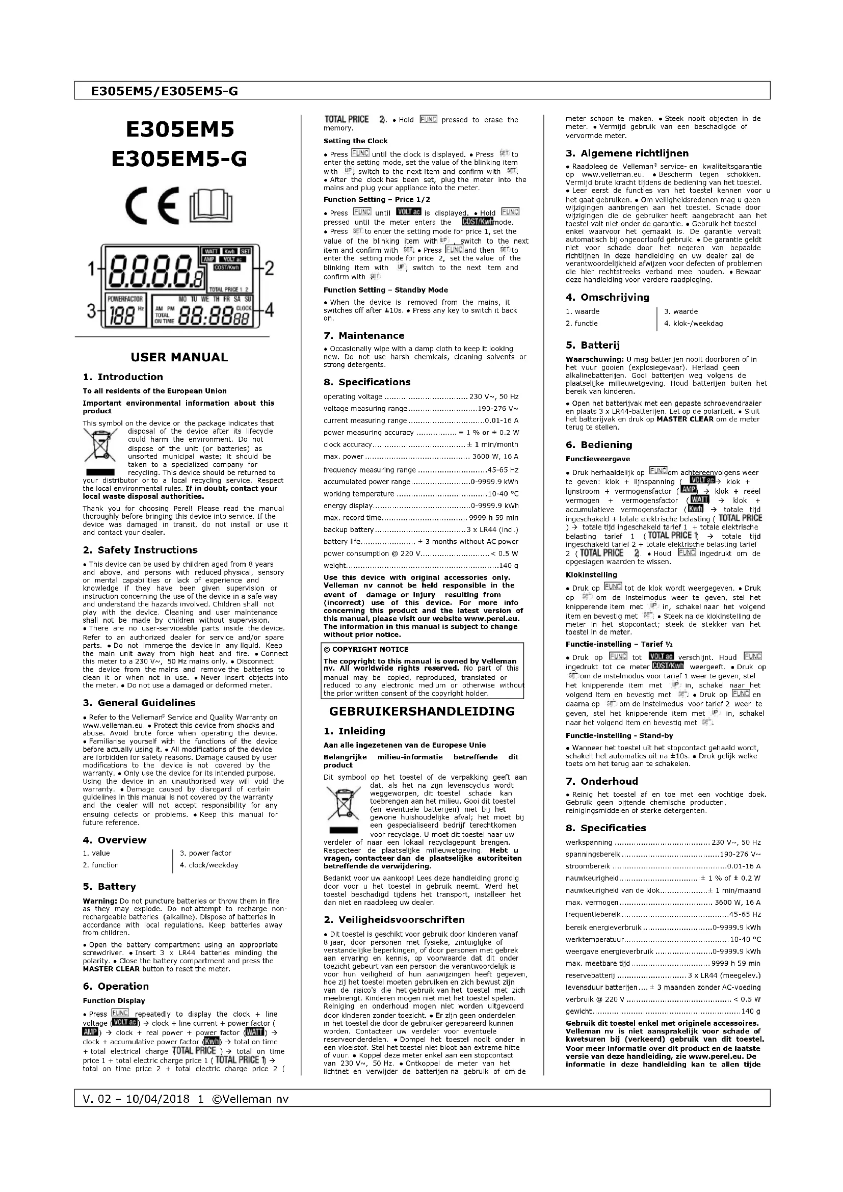 tension de service ................................... 230 V~, 50 Hz plage de mesure de tension .........................190-276 V~ plage de mesure de courant ............................0.01-16 A précision .......................................... ± 1 % ou ± 0.2 W précision de l'horloge ............................... ± 1 min/mois puissance max. ....................................... 3600 W, 16 A plage de mesure de fréquence ......................... 45-65 Hz plage de consommation énergétique ..........0-9999.9 kWh température de service ................................... 10-40 °C affichage consommation énergétique .........0-9999.9 kWh temps d'enregistrement max. .................. 9999 h 59 min pile de rechange .................................... 3 x LR44 (incl.) durée de vie des piles ...... ± 3 mois sans alimentation CA consommation @ 220 V.................................... < 0.5 W poids..................................................................140 g N'employer cet appareil qu’avec des accessoires d’origine. Velleman SA ne peut, dans la mesure conforme au droit applicable être tenue responsable des dommages ou lésions (directs ou indirects) pouvant résulter de l’utilisation de cet appareil. Pour plus d’informations concernant cet article et la dernière version de ce mode d'emploi, visiter notre site web www.perel.eu. Les spécifications et le continu de ce mode d'emploi peuvent être modifiés sans notification préalable.