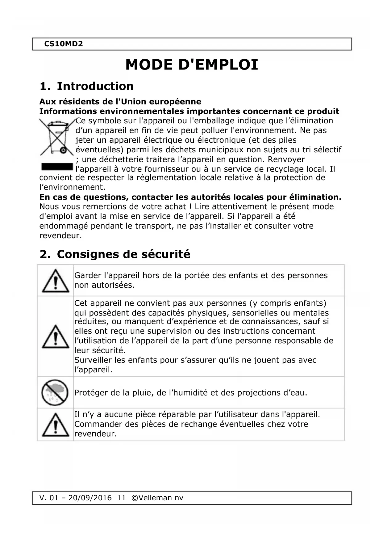 Retrouvez gratuitement la notice de l'appareil CS10MD2 VELLEMAN au format PDF.