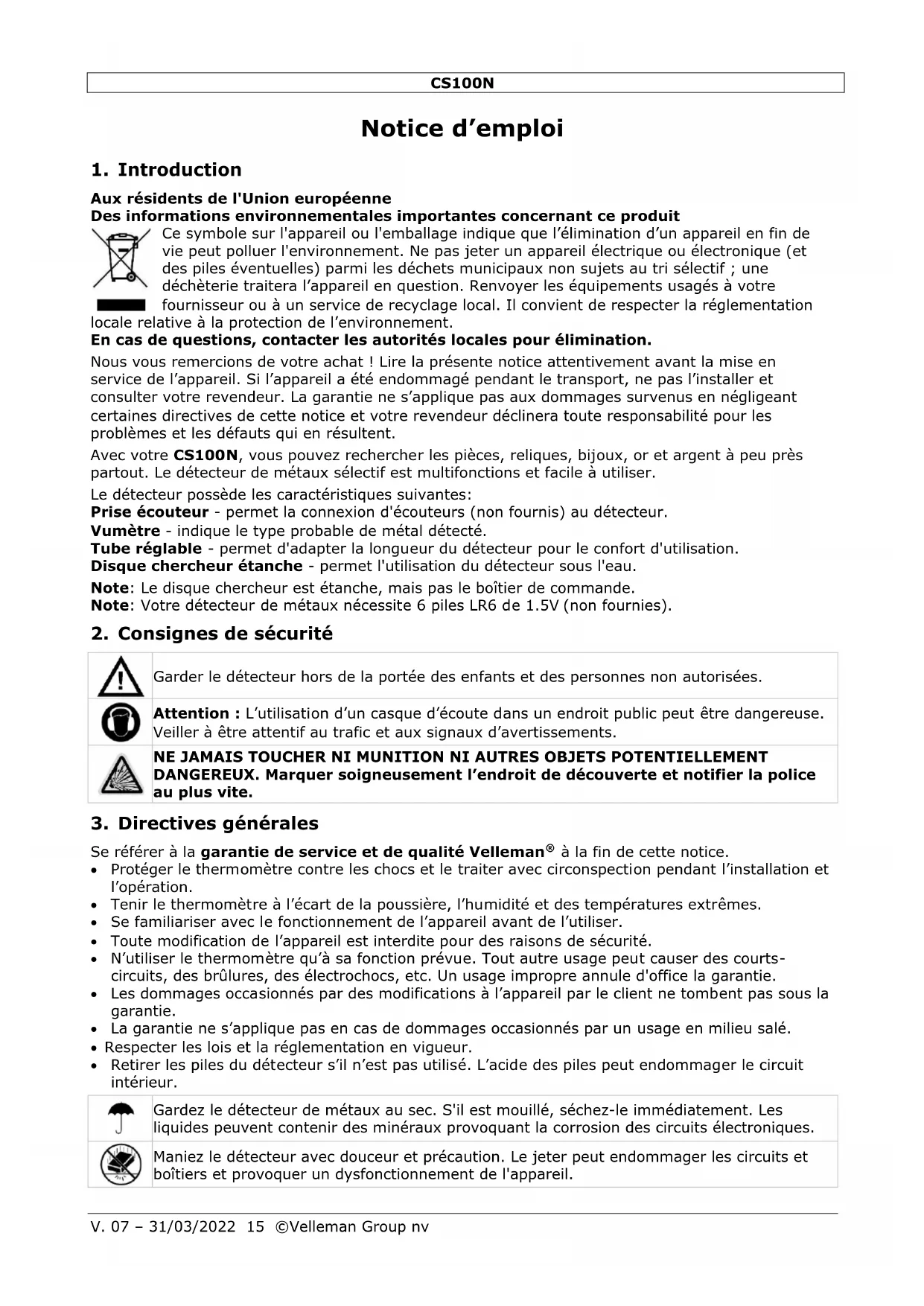 dimensions longueur 60~91cm tête de détection Ø16.5cm poids ±660g N’employer cet appareil qu’avec des accessoires d’origine. Velleman Group nv ne sera aucunement responsable de dommages ou lésions survenus à un usage (incorrect) de cet appareil. Pour plus d’information concernant cet article et la version la plus récente de cette notice, visitez notre site web www.velleman.eu. Toutes les informations présentées dans cette notice peuvent être modifiées sans notification préalable. Déclaration de conformité RED Le soussigné, Velleman Group nv, déclare que l'équipement radioélectrique du type [CS100N] est conforme à la directive 2014/53/EU. Le texte complet de la déclaration UE de conformité est disponible à l'adresse internet suivante: www.velleman.eu.