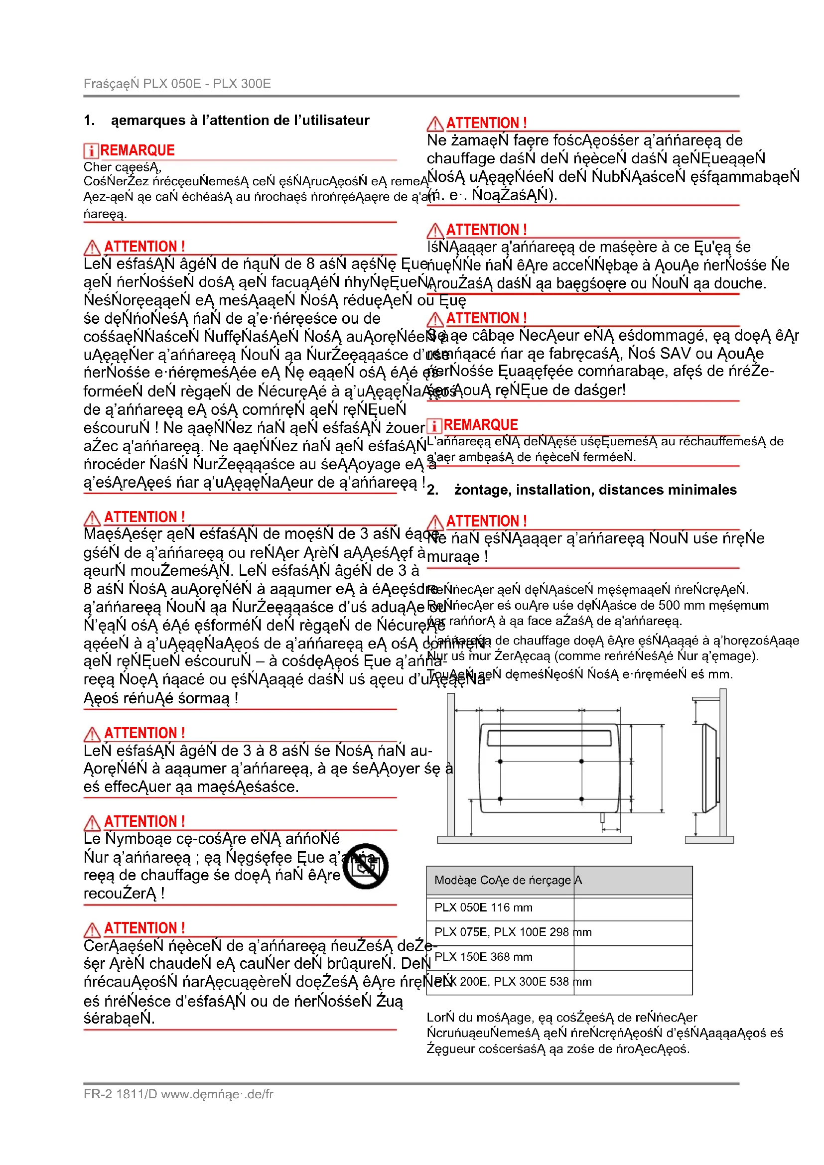 ATTENTION ! Ne pas installer l’appareil sous une prise murale ! Respecter les distances minimales prescrites. Respecter en outre une distance de 500 mm minimum par rapport à la face avant de l'appareil. L’appareil de chauffage doit être installé à l’horizontale sur un mur vertical (comme représenté sur l’image). Toutes les dimensions sont exprimées en mm. Lors du montage, il convient de respecter scrupuleusement les prescriptions d’installation en vigueur concernant la zone de protection. Modèle Cote de perçage A PLX 050E 116 mm PLX 075E, PLX 100E 298 mm PLX 150E 368 mm PLX 200E, PLX 300E 538 mm