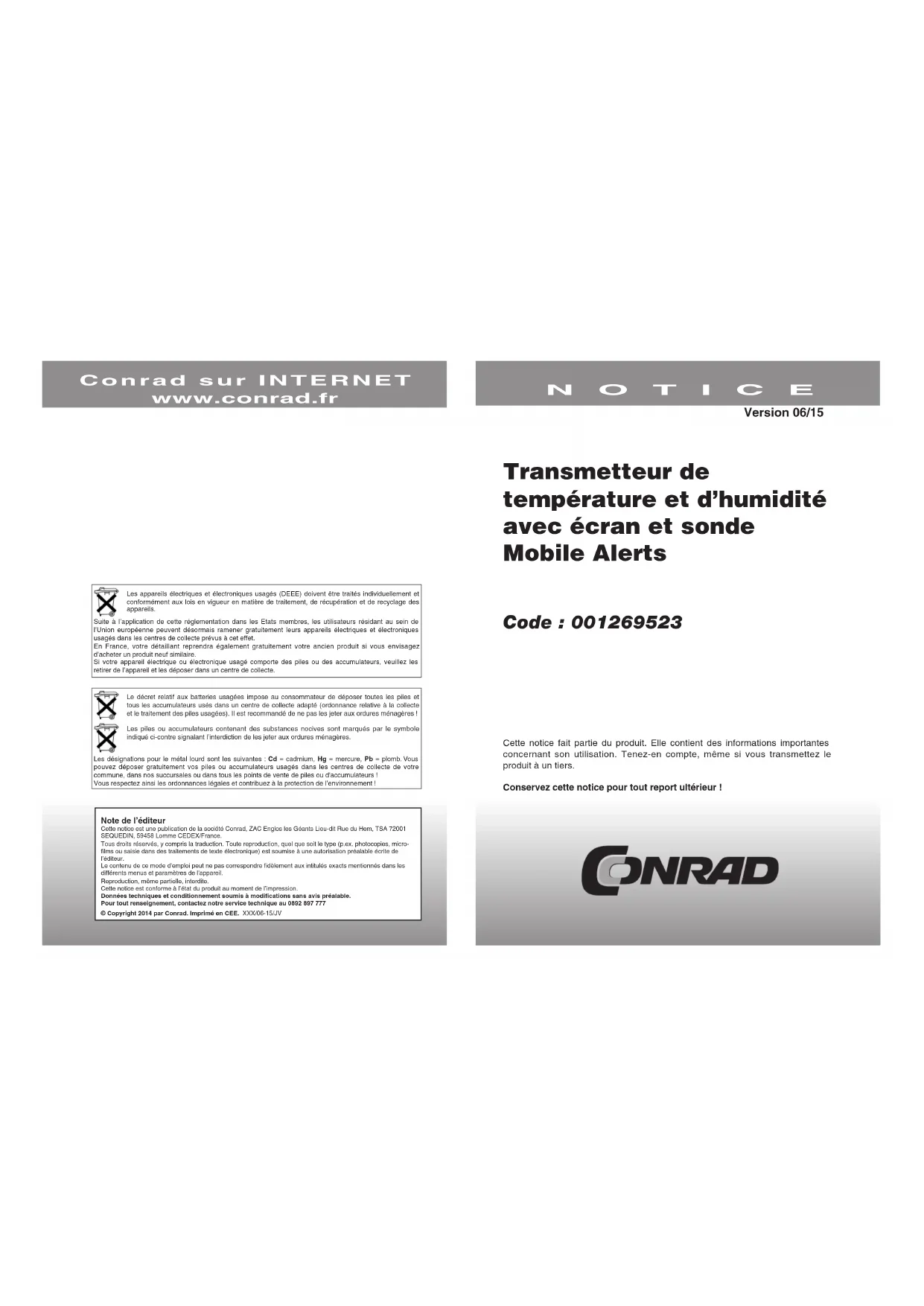 Transmetteur de température et d’humidité avec écran et sonde Mobile Alerts Code : 001269523 Cette notice fait partie du produit. Elle contient des informations importantes concernant son utilisation. Tenez-en compte, même si vous transmettez le produit à un tiers. Conservez cette notice pour tout report ultérieur ! NOTICE Conrad sur INTERNET www.conrad.fr Version 06/15 Les appareils électriques et électroniques usagés (DEEE) doivent être traités individuellement et conformément aux lois en vigueur en matière de traitement, de récupération et de recyclage des appareils.Suite à l’application de cette réglementation dans les Etats membres, les utilisateurs résidant au sein de l’Union européenne peuvent désormais ramener gratuitement leurs appareils électriques et électroniques usagés dans les centres de collecte prévus à cet effet.En France, votre détaillant reprendra également gratuitement votre ancien produit si vous envisagez d’acheter un produit neuf similaire.Si votre appareil électrique ou électronique usagé comporte des piles ou des accumulateurs, veuillez les retirer de l’appareil et les déposer dans un centre de collecte.Le décret relatif aux batteries usagées impose au consommateur de déposer toutes les piles et tous les accumulateurs usés dans un centre de collecte adapté (ordonnance relative à la collecte et le traitement des piles usagées). Il est recommandé de ne pas les jeter aux ordures ménagères !Les piles ou accumulateurs contenant des substances nocives sont marqués par le symbole indiqué ci-contre signalant l’interdiction de les jeter aux ordures ménagères. Les désignations pour le métal lourd sont les suivantes : Cd = cadmium, Hg = mercure, Pb = plomb. Vous pouvez déposer gratuitement vos piles ou accumulateurs usagés dans les centres de collecte de votre commune, dans nos succursales ou dans tous les points de vente de piles ou d'accumulateurs !Vous respectez ainsi les ordonnances légales et contribuez à la protection de l’environnement !Note de l’éditeurCette notice est une publication de la société Conrad, ZAC Englos les Géants Lieu-dit Rue du Hem, TSA 72001 SEQUEDIN, 59458 Lomme CEDEX/France.Tous droits réservés, y compris la traduction. Toute reproduction, quel que soit le type (p.ex. photocopies, micro-films ou saisie dans des traitements de texte électronique) est soumise à une autorisation préalable écrite de l’éditeur.Le contenu de ce mode d'emploi peut ne pas correspondre fidèlement aux intitulés exacts mentionnés dans les différents menus et paramètres de l'appareil.Reproduction, même partielle, interdite.Cette notice est conforme à l’état du produit au moment de l’impression.Données techniques et conditionnement soumis à modifications sans avis préalable.Pour tout renseignement, contactez notre service technique au 0892 897 777 © Copyright 2014 par Conrad. Imprimé en CEE. XXX/06-15/JV2 3 Capteur Mobile Alerts Cet appareil est un capteur faisant partie du système «Mobile-Alerts», il peut être exclusivement utilisé au sein de ce système. Vous avez besoin d’une passerelle pour faire fonctionner ce capteur. Insertion des piles dans le capteur externe Ouvrez le compartiment à piles du capteur et insérez 2 piles AAA en respectant la polarité. Ajout d’un émetteur Ouvrez l’application pour afficher l’aperçu. Cliquez sur «Ajouter un nouveau capteur» et scannez le QR Code situé à l’arrière du capteur de température. Attribuez enfin une désignation à l’émetteur. Caractéristiques techniques Piles : 2 piles alcalines LR03 (AAA) Durée de vie des piles : 2 ans env. Plage de mesure de la température : -39,9°C à +59,9°C Précision : 1 degré Plage de mesure de l’humidité ambiante : 20 à 99% Précision : 5% Intervalle de mesure : 7 minutes Portée : 100 m (champ libre) Longueur du câble de la sonde de mesure : 1,5 m
