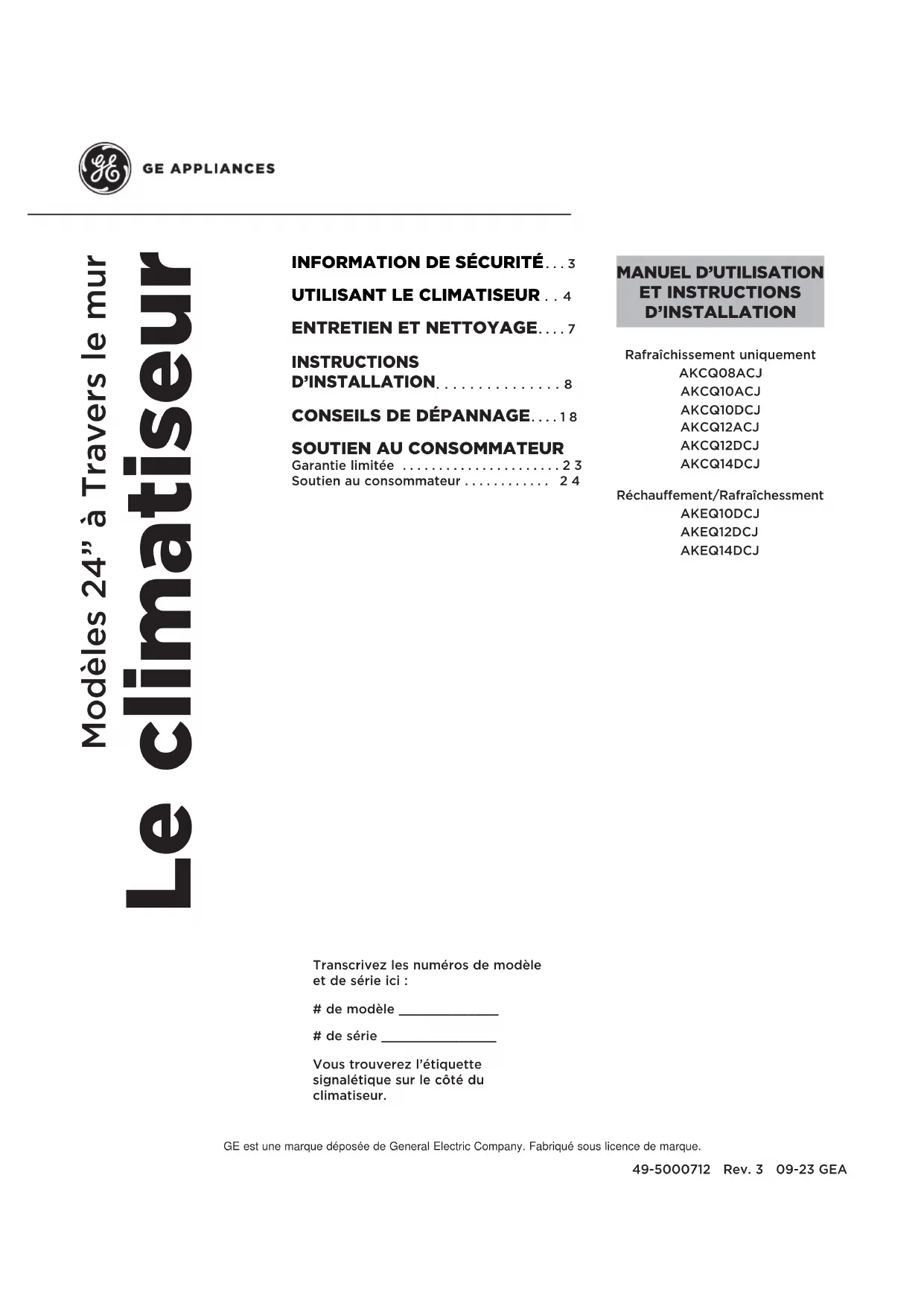 ET INSTRUCTIONS D’INSTALLATION Rafraîchissement uniquement AKCQ08ACJ AKCQ10ACJ AKCQ10DCJ AKCQ12ACJ AKCQ12DCJ AKCQ14DCJ Réchauffement/Rafraîchessment AKEQ10DCJ AKEQ12DCJ AKEQ14DCJ2 49-5000712 Rev. 3 NOUS VOUS REMERCIONS D’ACCUEILLIR GE APPLIANCES CHEZ VOUS Que vous ayez grandi avec GE Appliances ou qu’il s’agisse de votre première acquisition, nous sommes heureux de vous accueillir dans notre famille. Nous sommes fiers du savoir-faire, de l’innovation et de l’esthétique qui composent chaque appareil GE Appliances, et nous pensons que vous le serez aussi. Dans cette optique, nous vous rappelons que l’enregistrement de votre électroménager vous assure la communication de renseignements importants sur le produit et la garantie lorsque vous en avez besoin. Enregistrez votre électroménager GE en ligne dès maintenant. Des sites Web et des numéros de téléphone utiles figurent dans la section Soutien au consommateur de ce manuel d’utilisation.49-5000712 Rev. 3 3 Pour votre sécurité, vous devez suivre les instructions de ce manuel pour réduire les risques d’incendie, d’explosion, de choc électrique, de dommage à la propriété, de blessure ou de décès.Ŷ1¶XWLOLVH]FHWDSSDUHLOTXHSRXUVRQXVDJHSUpYXWHOTXHdécrit dans le Manuel de l’utilisateur.Ŷ9RXVGHYH]ELHQPRQWHUFHFRQGLWLRQQHXUFRQIRUPpPHQWaux Instructions de montage, avant de l’utiliser.Ŷ1HGpEUDQFKH]MDPDLVYRWUHFRQGLWLRQQHXUHQWLUDQWVXUle cordon d’alimentation. Saisissez fermement la fiche et sortez-la droit de sa prise. Ŷ5HPSODFH]LPPpGLDWHPHQWWRXWFRUGRQG¶DOLPHQWDWLRQabîmé ou endommagé. Un cordon d’alimentation électrique endommagé ne doit pas être réparé mais plutôt remplacé par un autre cordon d’alimentation obtenu du fabricant. N’utilisez pas un cordon d’alimentation qui montre des fissures ou des signes d’abrasion sur sa longueur ou encore près de la prise ou du connecteur.ŶeWHLJQH]HWGpEUDQFKH]YRWUHFOLPDWLVHXUDYDQWGHSURFpGHUà une réparation ou un nettoyage.Ŷ3RXUYRWUHVpFXULWp«QHUDQJH]MDPDLVRXQ¶XWLOLVH]MDPDLVdes matériaux combustibles, de l’essence ou d’autres vapeurs ou liquides inflammables à proximité de cet appareil ou de tout autre appareil électroménager. Ŷ6LODSULVHpOHFWULTXHQ¶HVWSDVFRPSDWLEOHDYHFODILFKHdu cordon électrique, il faut faire remplacer la prise par un électricien agréé.Ŷ*($SSOLDQFHVQREULQGDVRSRUWHVREUHQLQJ~QVHUYLFLRtécnico de componentes del sistema sellado (es decir: piezas que contengan refrigerante) del acondicionador de aire.Ŷ(OVHUYLFLRWpFQLFRGHOUHVWRGHORVFRPSRQHQWHV6Ï/2podrá ser completado por un técnico calificado.Ŷ(VWHHOHFWURGRPpVWLFRQRGHEHUiVHUXVDGRSRUSHUVRQDV(incluyendo niños) con capacidades físicas, sensoriales o mentales reducidas o con falta de experiencia y conocimiento, a menos que cuenten con supervisión o instrucción con relación al uso de este electrodoméstico por parte de una persona responsable de su seguridad.Ŷ6HGHEHUiVXSHUYLVDUDORVQLxRVDILQGHDVHJXUDUTXHQRVHMXHJXHFRQHOHOHFWURGRPpVWLFRŶ1RXWLOLFHVXDFRQGLFLRQDGRUGHDLUHHQXQDKDELWDFLyQK~PHGDWDOFRPRXQEDxRRODYDGHURŶ(OHOHFWURGRPpVWLFRVHGHEHUiJXDUGDUDILQGHHYLWDUTXHse produzcan daños mecánicos.