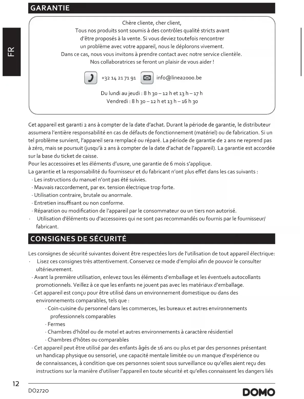 GARANTIE Chère cliente, cher client, Tous nos produits sont soumis à des contrôles qualité stricts avant d’être proposés à la vente. Si vous deviez toutefois rencontrer un problème avec votre appareil, nous le déplorons vivement. Dans ce cas, nous vous invitons à prendre contact avec notre service clientèle. Nos collaboratrices se feront un plaisir de vous aider ! +32 14 21 71 91 info@linea2000.be Du lundi au jeudi : 8 h 30 – 12 h et 13 h – 17 h Vendredi : 8 h 30 – 12 h et 13 h – 16 h 30 Cet appareil est garanti 2 ans à compter de la date d’achat. Durant la période de garantie, le distributeur assumera l’entière responsabilité en cas de défauts de fonctionnement (matériel) ou de fabrication. Si un tel problème survient, l’appareil sera remplacé ou réparé. La période de garantie de 2 ans ne reprend pas à zéro, mais se poursuit (jusqu’à 2 ans à compter de la date d’achat de l’appareil). La garantie est accordée sur la base du ticket de caisse. Pour les accessoires et les éléments d’usure, une garantie de 6 mois s’applique. La garantie et la responsabilité du fournisseur et du fabricant n’ont plus eet dans les cas suivants :