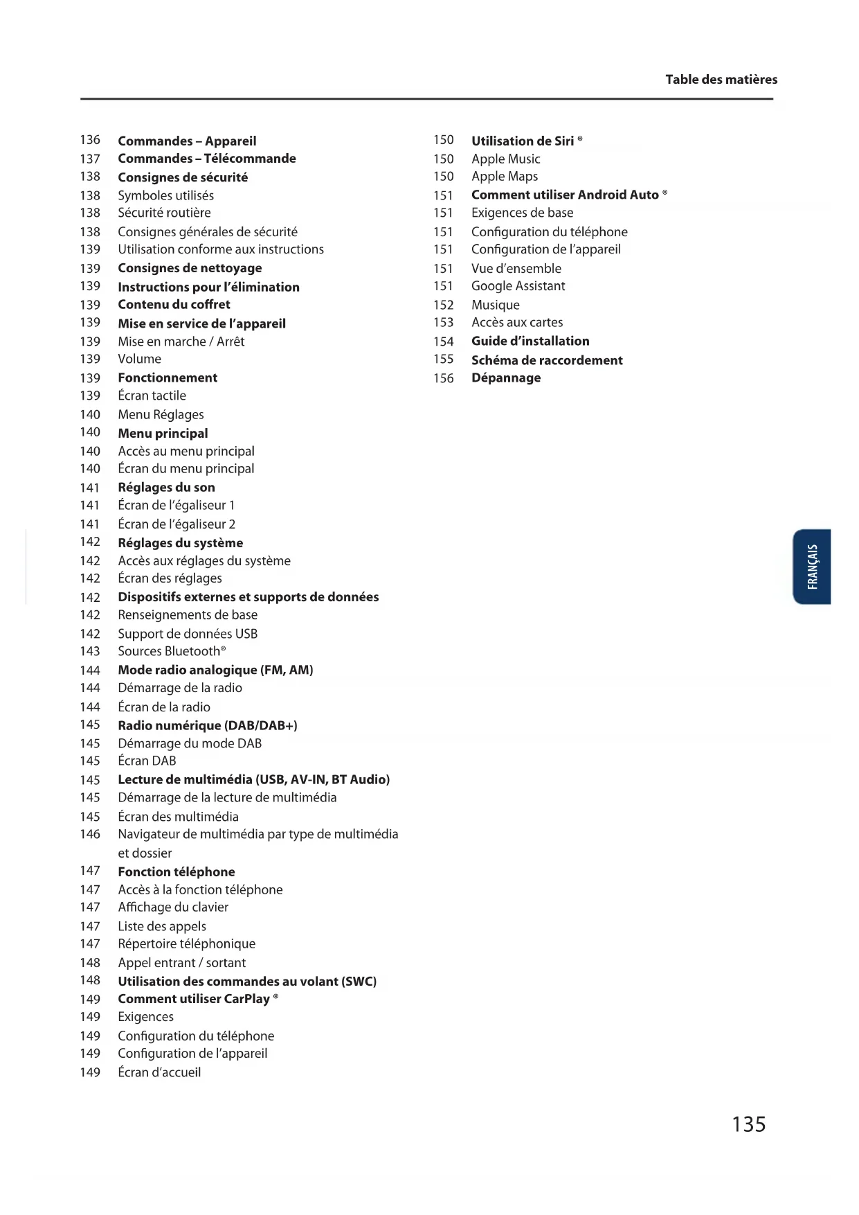 Utilisation de Siri ® Apple Music Apple Maps Comment utiliser Android Auto ® Exigences de base Conguration du téléphone Conguration de l’appareil Vue d’ensemble Google Assistant Musique Accès aux cartes Guide d’installation Schéma de raccordement Dépannage Table des matières FRANÇAIS 135Commandes – Appareil