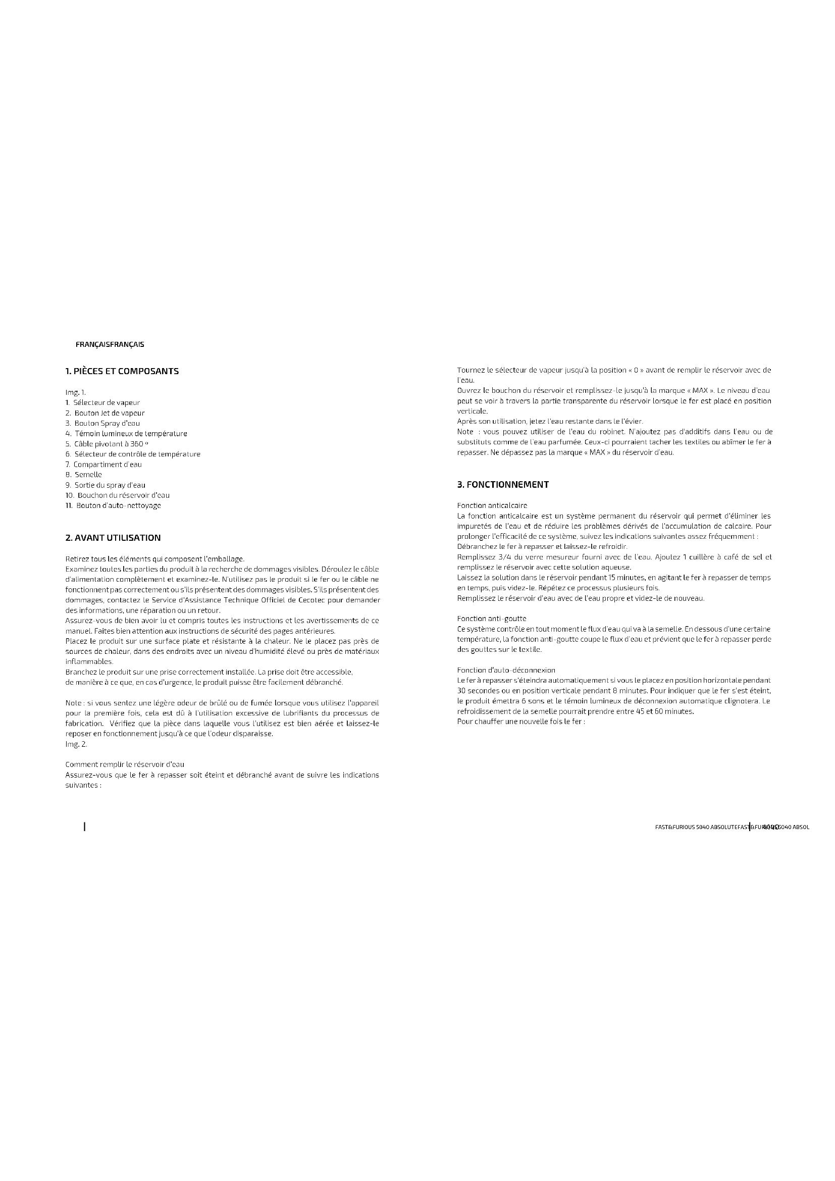 Veuillez lire les instructions suivantes avec attention avant d’utiliser l’appareil. Gardez bien ce manuel pour de futures références ou pour tout nouvel utilisateur. Veuillez suivre ces instructions de sécurité très attentivement lorsque vous utilisez l’appareil. Assurez-vous que le voltage du réseau coïncide avec le voltage spécifié sur l’étiquette de classification de l’appareil et que la prise possède une connexion à terre. Ne submergez ni le câble, ni la prise ni aucune autre partie fixe du produit dans l’eau ni dans aucun autre liquide. N’exposez pas les connexions électriques à l’eau. Assurez-vous d’avoir les mains complètement sèches avant de toucher la prise ou d’allumer l’appareil. Si le produit tombe accidentellement dans l’eau, débranchez- le immédiatement. Ne touchez pas l’eau ! Ne tordez, ni pliez, ni n’étirez ni n’abîmez le câble d’alimentation. Protégez-le des bords pointus et des sources de chaleur. Ne laissez pas le câble toucher les surfaces chaudes Ne laissez pas que le câble dépasse de la surface ou du plan de travail. Cet appareil ne peut pas être utilisé à travers d’une minuterie externe ou d’un système par télécommande sans fil. Éteignez et débranchez l’appareil de la source d’alimentation lorsque vous avez fini de l’utiliser et avant de le nettoyer. Tirez sur la fiche pour le débrancher ; ne tirez pas sur le câble. Ce produit a été conçu pour repasser des textiles. Cet appareil a été conçu pour un usage exclusivement domestique. Il n’est pas approprié pour un usage commercial ni industriel. Ne l’utilisez pas à l’extérieur. Pour évites des brûlures ou des dommages, ne repassez pas les vêtements tout en les portant.N’utilisez pas d’accessoires qui ne soient pas recommandés par Cecotec, cela pourrait abîmer le produit. Placez le produit sur une surface sèche, stable et plate, résistante à la chaleur. La température des surfaces accessibles pourrait être élevée lorsque vous utilisez l’appareil et pourrait provoquer des brûlures. Ne touchez pas les surfaces chaudes lorsque l’appareil est en fonctionnement ni immédiatement après. Débranchez immédiatement l’appareil si vous observez du feu ou de la fumée. Ne laissez pas le produit sans surveillance s’il est en fonctionnement. Débranchez le produit de la source d’alimentation lorsque vous terminez de l’utiliser ou lorsque vous quittez la pièce. Le produit ne doit pas être connecté lorsque vous remplissez ou videz le réservoir d’eau. Le bouchon du réservoir d’eau ne doit pas être ouvert lorsque l’appareil est en fonctionnement. Il est recommandé d’utiliser l’eau du robinet. Si le contenu en calcaire de l’eau du robinet est trop élevé, réalisez un mélange avec 50 % d’eau du robinet et 50 % d’eau déminéralisée. N’utilisez pas uniquement de l’eau déminéralisée. Les pièces métalliques chaudes, l’eau chaude ou la vapeur peuvent produire des brûlures. Il peut avoir des fuites d’eau chaude. Faites attention lorsque vous remplissez le réservoir ou renversez le fer. Pour éviter des brûlures ou des dommages, ne dirigez pas la vapeur vers les personnes ou vers les animaux lorsque vous repassez. Le fer à repasser doit être utilisé sur des surfaces stables. Lorsque vous placez le fer sur sa base, assurez-vous que la surface est stable. Maintenir le fer à une température maximale pendant longtemps pourrait provoquer une décoloration du fer qui n’affectera pas son fonctionnement. N’essayez pas de réparer le produit vous-même. Contactez le Service Après-Vente Officiel de Cecotec. Le nettoyage et l’entretien du produit doivent être réalisés en accord avec ce manuel d’instructions pour assurer le correct fonctionnement du produit. Éteignez et débranchez l’appareil avant de le déplacer ou de le nettoyer. Laissez-le refroidir complètement avant de le nettoyer ou de le ranger. Le nettoyage et l’entretien ne doivent pas être réalisés par des enfants. Gardez l’appareil et son manuel d’instructions dans un lieu sec et sécurisé lorsque vous n’allez pas l’utiliser. Cecotec n’acceptera aucune responsabilité quant aux dommages et lésions liés à une utilisation inadéquate du produit. Toute utilisation incorrecte ou tout non-respect de ce manuel annulera la garantie du produit et les responsabilités du fabricant. Si le câble d’alimentation est endommagé, il doit être substitué par le Cecotec, par le Service Après-Vente ou par du personnel qualifié pour éviter des dangers. L’appareil ne doit pas être utilisé par des enfants de 0 à 8 ans. Cet appareil peut être utilisé par des enfants de 8 ans et plus s’ils sont surveillés constamment. Cet appareil peut être utilisé par des personnes aux capacités physiques, mentales ou sensorielles réduites, ou sans expérience ni connaissances si elles sont surveillées et/ou ont reçu les informations nécessaires à l’utilisation correcte de l’appareil et qu’elles ont bien compris les risques qu’il implique. Surveillez les enfants pour vous assurer qu’ils ne jouent pas avec le produit. Une surveillance stricte est nécessaire si le produit est utilisé par ou à côté des enfants.Maintenez l’appareil et son câble hors de portée des enfants de moins de 8 ans.