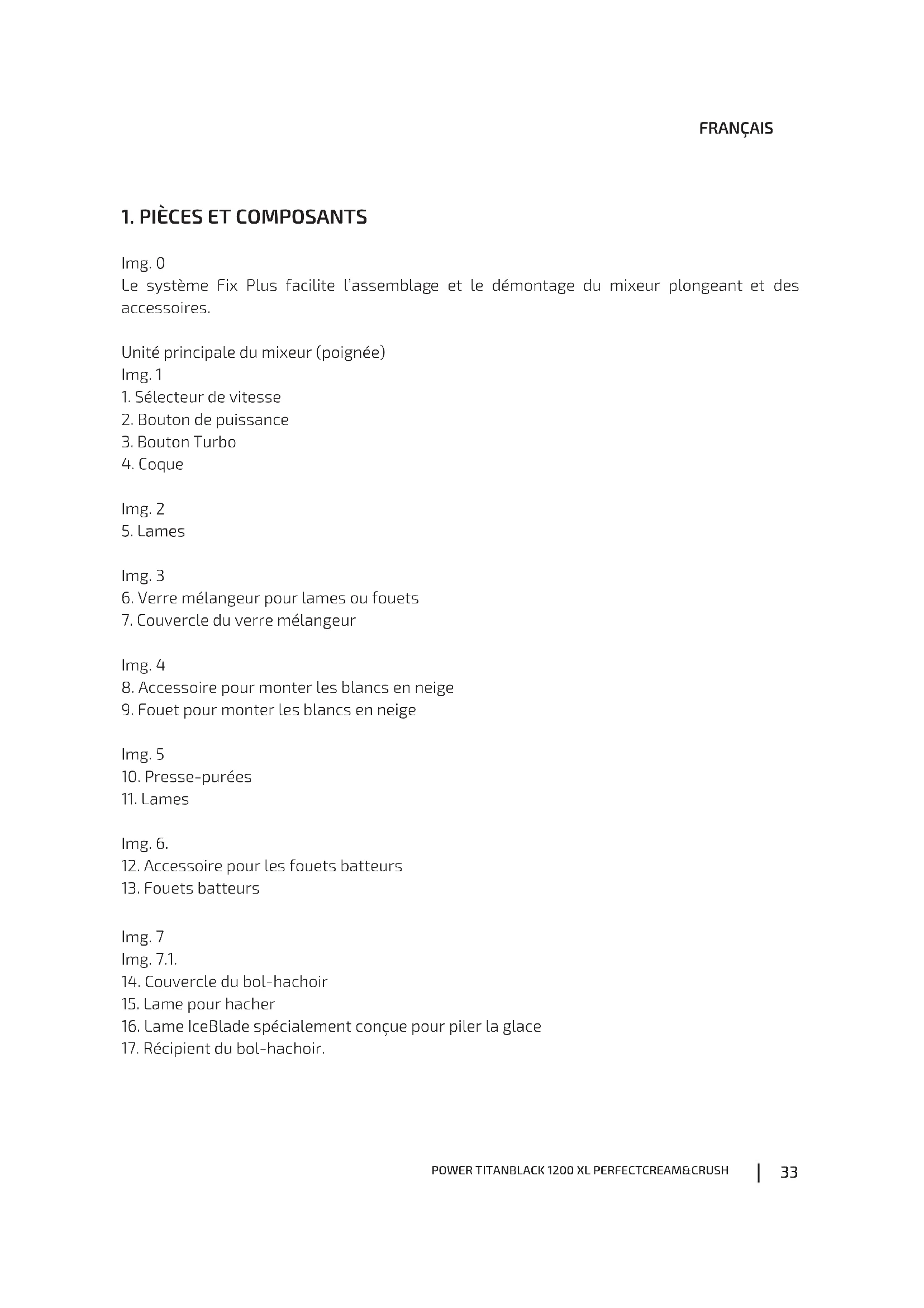 FRANÇAIS Img. 4 Img. 6. Temps d’utilisation approximatif : 15 secondes. Convient pour battre des aliments doux comme les blancs d'œufs, la crème, les desserts rapides, les œufs ou le sucre. Ne battez pas des mélanges plus durs comme de la margarine. Cela pourrait abîmer les fouets. Unissez les fouets avec le support pour les fouets. Placez la poignée du mixeur dans l’accessoire des fouets et emboîtez-la jusqu’à entendre un click. Introduisez les aliments dans un récipient. Ne battez plus de 6 blancs d'œufs ou 1000 ml de crème en même temps. Ne laissez pas le liquide surpasser les fouets. Branchez l’appareil et appuyez sur le bouton de connexion. Après l’avoir utilisé, débranchez-le et démontez-le. Presse-purées Img. 5 Introduisez les aliments dans un verre pour mélanger ou dans un récipient assez grand. Branchez l’appareil sur une prise de courant. Sélectionnez la conguration sur le presse-purées ajustable. Sélectionnez la vitesse élevée avec le sélecteur de vitesse. Plongez le presse-purées dans les ingrédients et appuyez sur le bouton de fonctionnement pour connecter le presse-purées. Bougez doucement le presse-purées jusqu’à obtenir la texture souhaitée. Éteignez le moteur en lâchant le bouton. Sortez le presse-purées du récipient et débranchez l’appareil. Bol-hachoir de 600 ml Img. 7/7.1 Convient pour hacher de la viande, du fromage, des légumes, des épices, du pain, des biscuits et des fruits secs. Enlevez tous types de noyaux qui puissent avoir les aliments, puis coupez ceux-ci en morceaux avec 1-2 cm d’épaisseur. Installez la lame pour hacher ou la lame IceBlade qui pile la glace dans le récipient. Ajoutez les aliments au récipient. Placez le couvercle et xez-le en le tournant. Placez la poignée du mixeur et xez-le aussi en le tournant. Tenez fermement le récipient, puis branchez l’appareil sur une prise de courant. Ensuite, appuyez sur le bouton de connexion. Après avoir utilisé l’appareil, débranchez-le de la prise de courant, démontez les pièces et nettoyez-les de manière adéquate.POWER TITANBLACK 1200 XL PERFECTCREAM&CRUSH