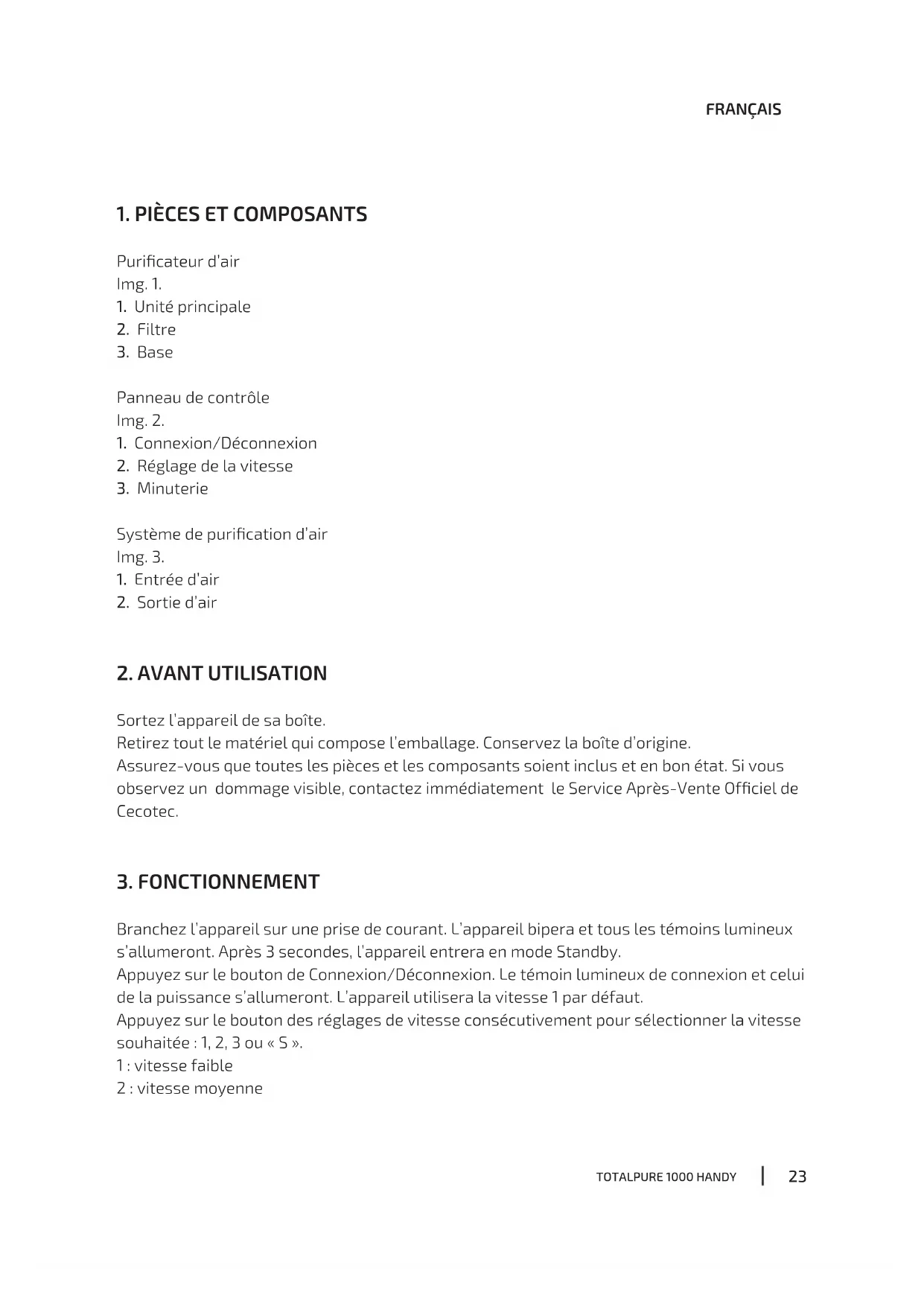 Branchez l’appareil sur une prise de courant. L’appareil bipera et tous les témoins lumineux s’allumeront. Après 3 secondes, l’appareil entrera en mode Standby. Appuyez sur le bouton de Connexion/Déconnexion. Le témoin lumineux de connexion et celui de la puissance s’allumeront. L’appareil utilisera la vitesse 1 par défaut. Appuyez sur le bouton des réglages de vitesse consécutivement pour sélectionner la vitesse souhaitée : 1, 2, 3 ou « S ». 1 : vitesse faible 2 : vitesse moyenne24 FRANÇAIS TOTALPURE 1000 HANDY 3 : vitesse élevée S : mode Sleep (nuit) Appuyez sur le bouton de la minuterie pour sélectionner combien d’heures vous souhaitez que l’appareil fonctionne : 1, 3, 7 ou 15 heures. Une fois le temps sélectionné écoulé, l’appareil s’éteindra automatiquement. Appuyez de nouveau le bouton de Connexion/Déconnexion pour éteindre l’appareil.
