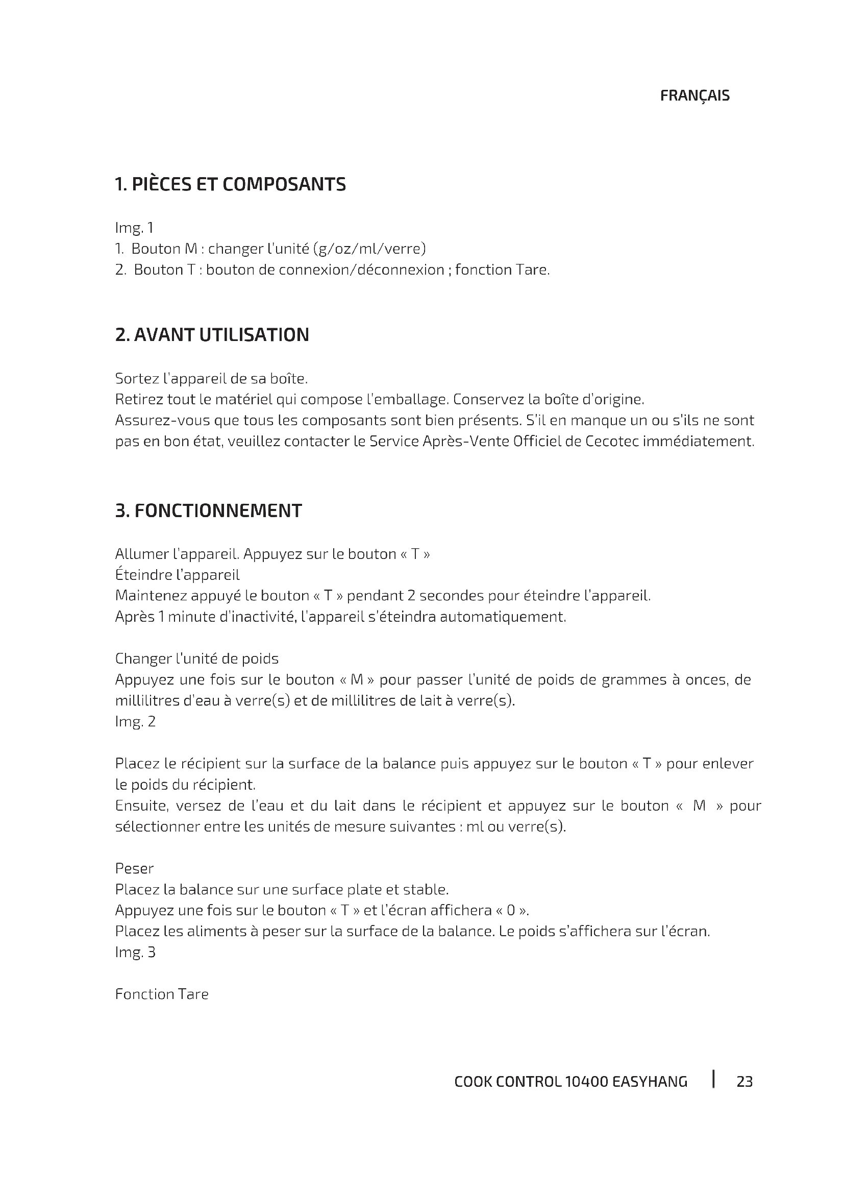 Allumer l’appareil. Appuyez sur le bouton « T » Éteindre l’appareil Maintenez appuyé le bouton «T» pendant 2 secondes pour éteindre l’appareil. Après 1 minute d’inactivité, l’appareil s’éteindra automatiquement. Changer l’unité de poids Appuyez une fois sur le bouton «M» pour passer l’unité de poids de grammes à onces, de millilitres d’eau à verre(s) et de millilitres de lait à verre(s). Img. 2 Placez le récipient sur la surface de la balance puis appuyez sur le bouton «T» pour enlever le poids du récipient. Ensuite, versez de l’eau et du lait dans le récipient et appuyez sur le bouton « M » pour sélectionner entre les unités de mesure suivantes: ml ou verre(s). Peser Placez la balance sur une surface plate et stable. Appuyez une fois sur le bouton «T» et l’écran affichera «0». Placez les aliments à peser sur la surface de la balance. Le poids s’affichera sur l’écran. Img. 3 Fonction Tare 04179_Cook Control 10400 EasyHang_manual_EA_YV_03200917.indd 2304179_Cook Control 10400 EasyHang_manual_EA_YV_03200917.indd 23 17/9/20 13:2717/9/20 13:2724 FRANÇAIS