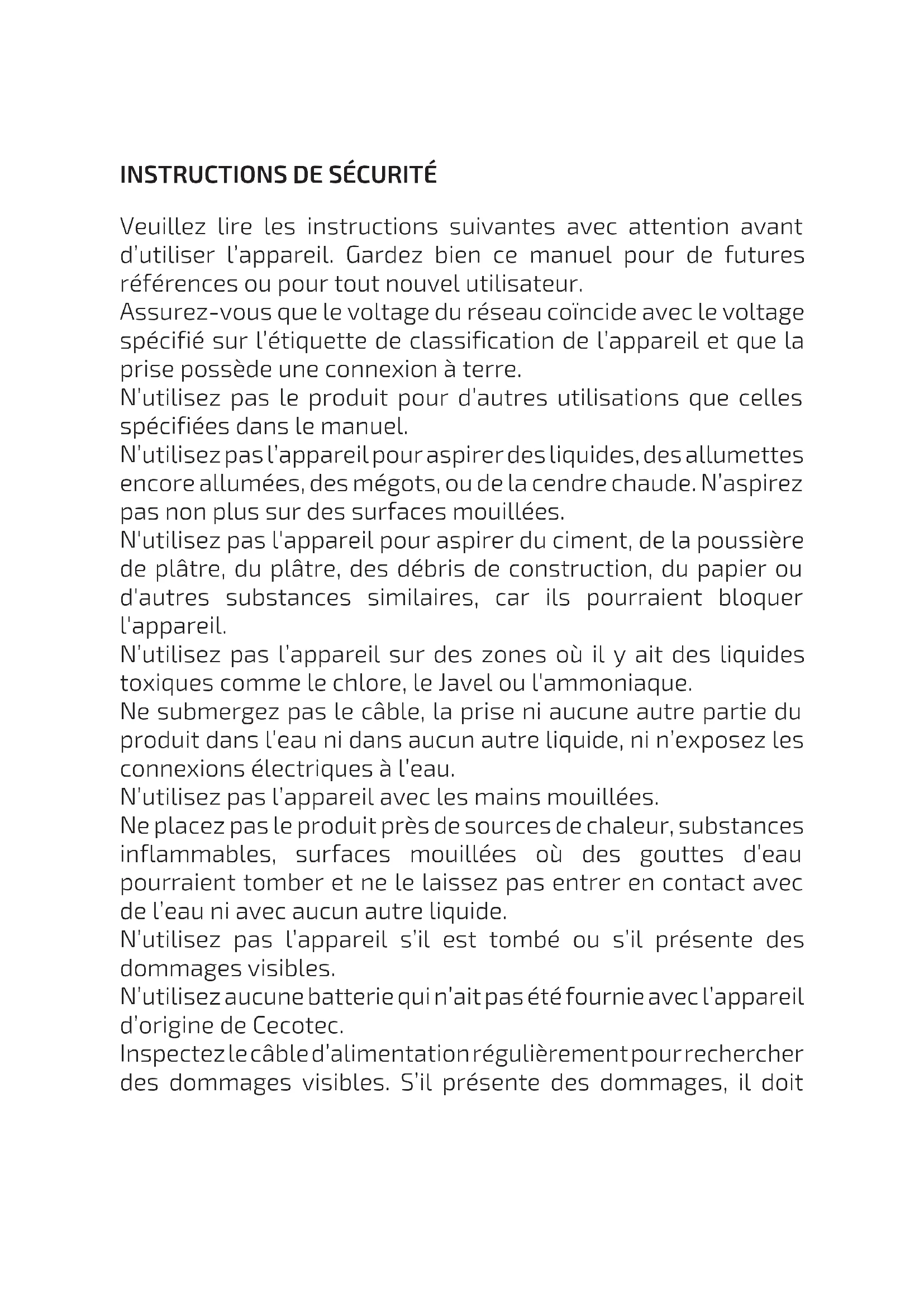 Ce produit possède une garantie de 2 ans à partir de la date d’achat, à condition de toujours présenter la facture d’achat, que le produit soit en parfait état, et ait été utilisé correctement comme indiqué dans ce manuel d’instructions. La garantie ne couvre pas : Un produit qui ait été utilisé en-dehors de ses capacités ou usages normaux, ayant subi des coups, ayant été abîmé, exposé à l’humidité, submergé dans un liquide ou une substance corrosive, ainsi que tous les incidents dont la faute serait imputable au consommateur. Un produit qui ait été démonté, modifié ou réparé par des personnes non autorisées par le Service Après-Vente Officiel de Cecotec. Lorsque le problème a été provoqué par l’usure normale des composants dû à l’utilisation. Le service de garantie couvre tous les défauts de fabrication pendant 2 ans selon la législation en vigueur, à l’exception des pièces consommables. Dans le cas d’une mauvaise utilisation de la part de l’utilisateur, le service de garantie ne se fera pas responsable de la réparation. Si vous détectez un incident ou un problème avec le produit, ou vous avez des doutes concernant le produit, veuillez contacter le Service Après-Vente Officiel de Cecotec au +34 9