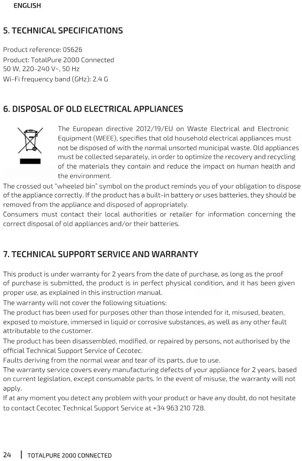 Ce produit possède une garantie de 2 ans à partir de la date d’achat, à condition de toujours présenter la facture d’achat, que le produit soit en parfait état, et ait été utilisé correctement comme indiqué dans ce manuel d’instructions. La garantie ne couvre pas :29 FRANÇAIS TOTALPURE 2000 CONNECTED Un produit qui ait été utilisé en-dehors de ses capacités ou usages normaux, ayant subi des coups, ayant été abîmé, exposé à l’humidité, submergé dans un liquide ou une substance corrosive, ainsi que tous les incidents dont la faute serait imputable au consommateur. Un produit qui ait été démonté, modié ou réparé par des personnes non autorisées par le Service Après-Vente Ofciel de Cecotec. Lorsque le problème a été provoqué par l’usure normale des composants dû à l’utilisation. Le service de garantie couvre tous les défauts de fabrication pendant 2 ans selon la législation en vigueur, à l’exception des pièces consommables. Dans le cas d’une mauvaise utilisation de la part de l’utilisateur, le service de garantie ne se fera pas responsable de la réparation. Si vous détectez un incident ou un problème avec le produit, ou vous avez des doutes concernant le produit, veuillez contacter le Service Après-Vente Ofciel de Cecotec au +34 9 63 21 07 28.30 DEUTSCH TOTALPURE 2000 CONNECTED
