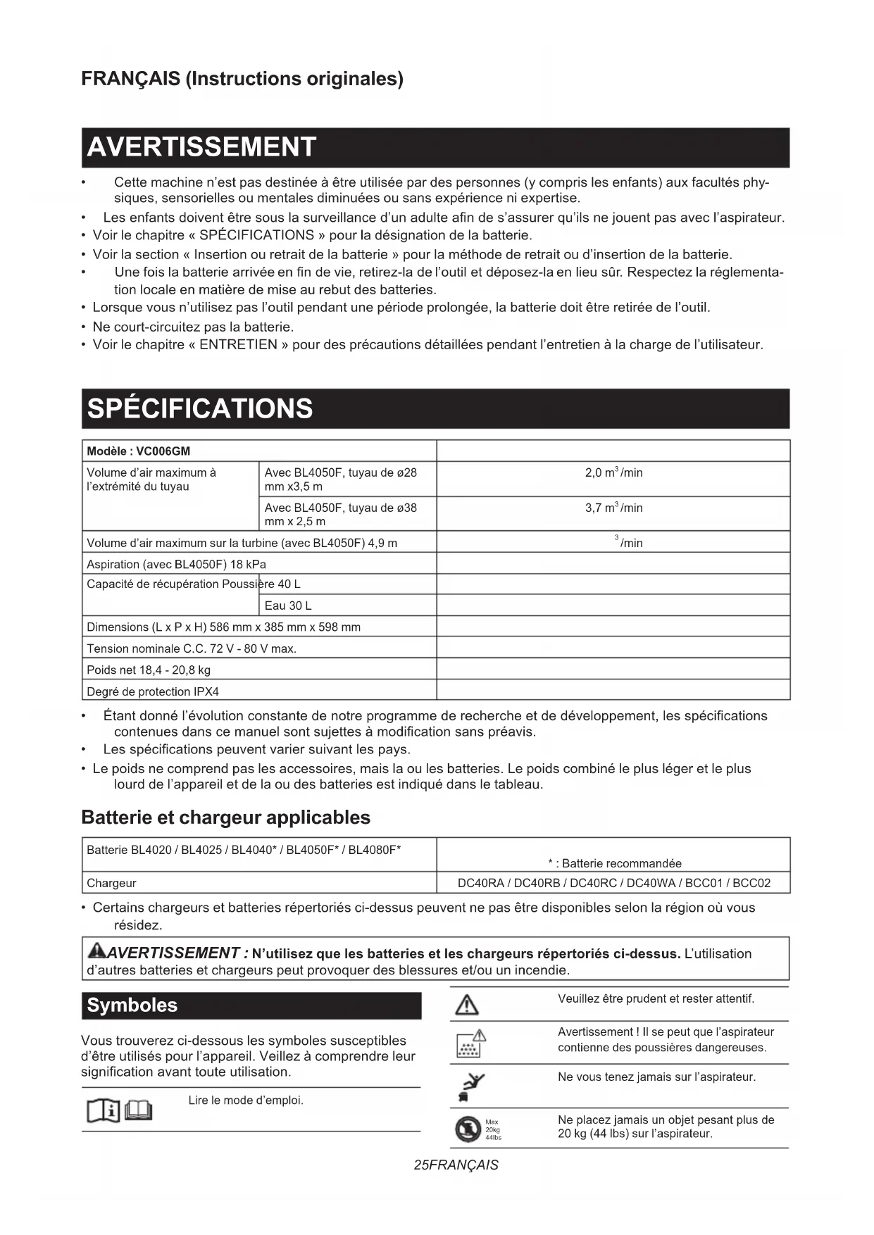 /min Aspiration (avec BL4050F) 18 kPa Capacité de récupération Poussière 40 L Eau 30 L Dimensions (L x P x H) 586 mm x 385 mm x 598 mm Tension nominale C.C. 72 V - 80 V max. Poids net 18,4 - 20,8 kg Degré de protection IPX4