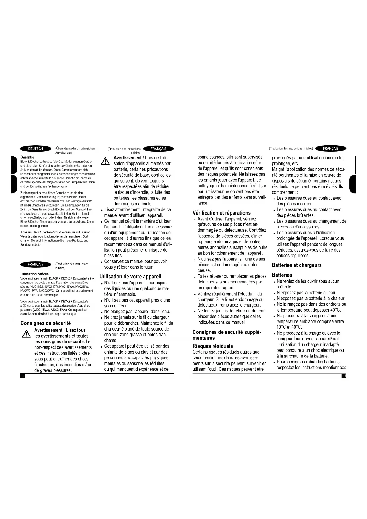 (Übersetzung der ursprünglichen Anweisungen) DEUTSCH (Traduction des instructions initiales) FRANÇAIS Utilisation prévue Votre aspirateur à main BLACK + DECKER Dustbuster a été conçu pour les petits travaux d'aspiration des poussières sèches (NVC115JL, NVC115W, NVC115WA, NVC215W, NVCW215WA, NVC220WC). Cet appareil est exclusivement destiné à un usage domestique.Votre aspirateur à main BLACK + DECKER Dustbuster® a été conçu pour les petits travaux d'aspiration d'eau et de poussière (WDC115WA, WDC215WA). Cet appareil est exclusivement destiné à un usage domestique. Consignes de sécurité