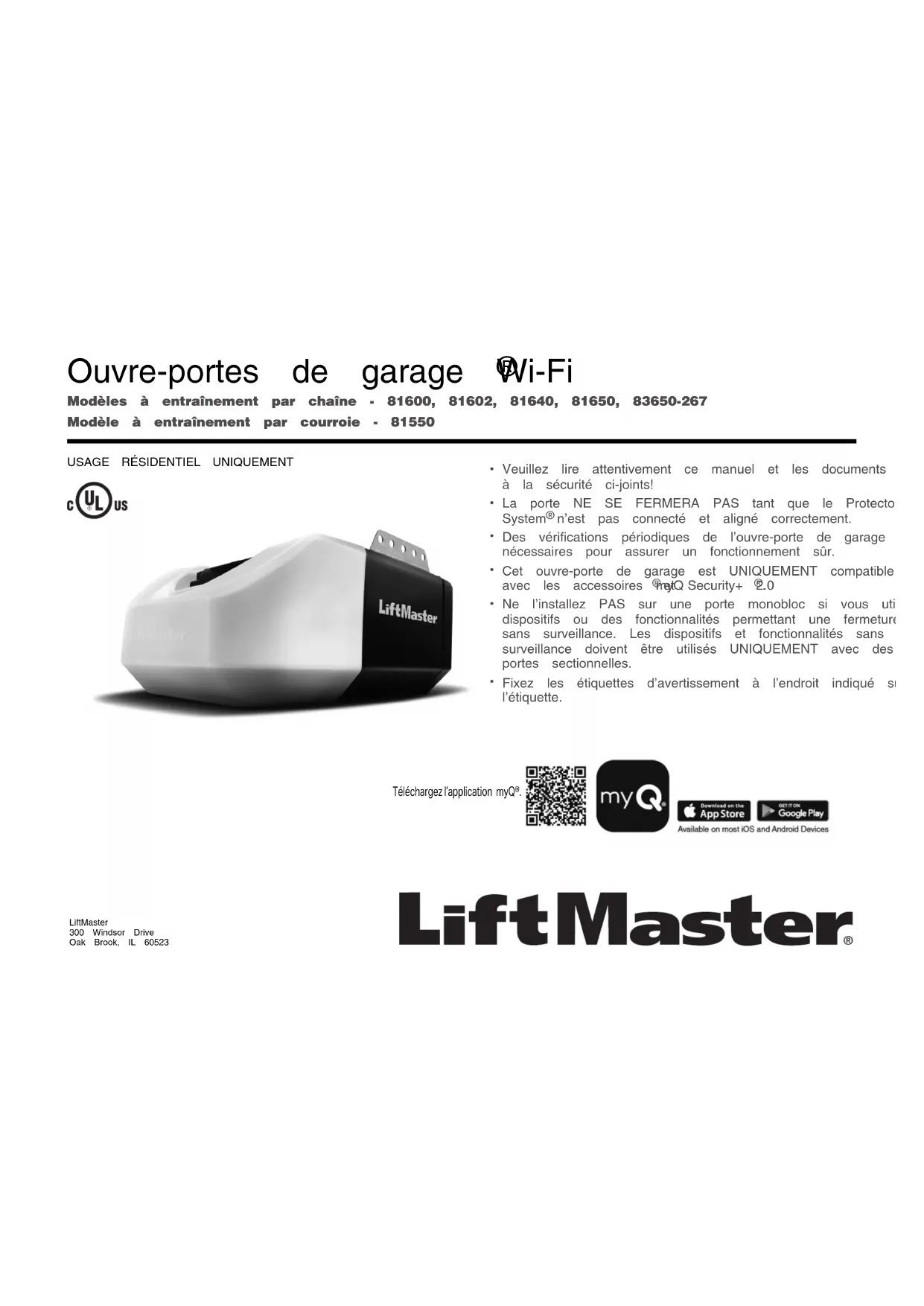 Fixez les étiquettes d’avertissement à l’endroit indiqué sur l’étiquette. Téléchargez l’application myQ®. LiftMaster300 Windsor DriveOak Brook, IL 605232 Table des matières Préparation