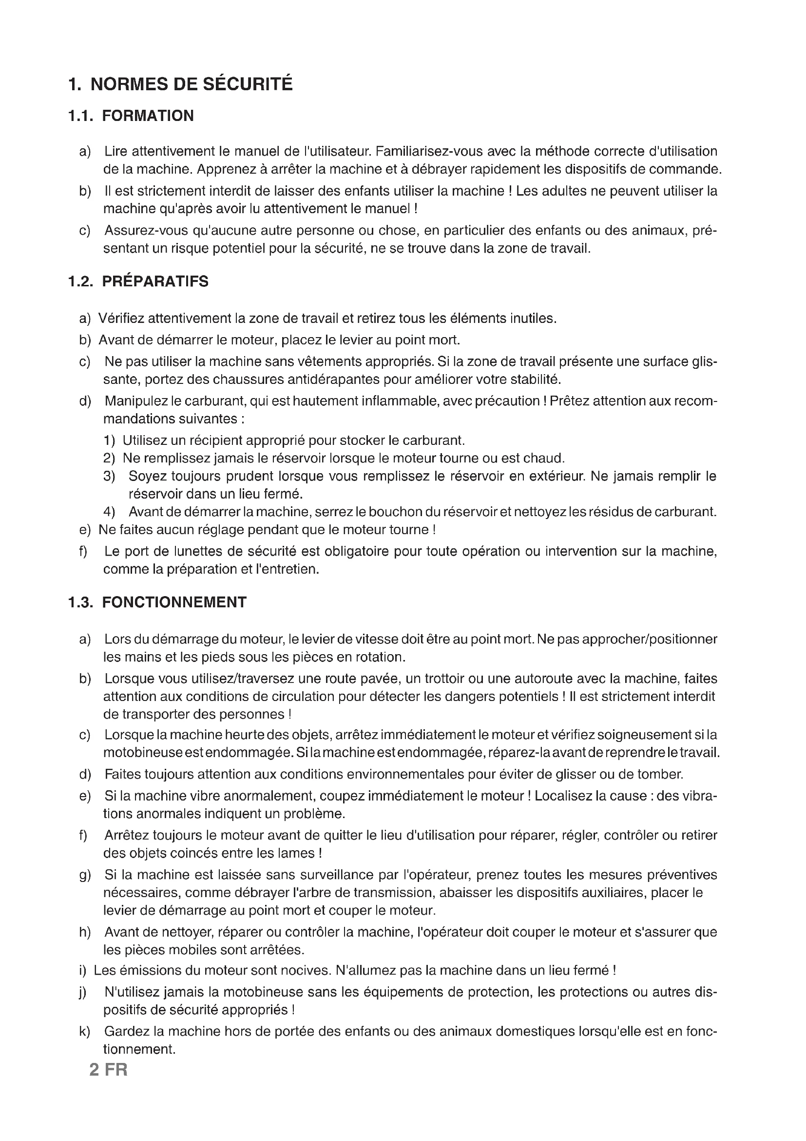 e) Ne faites aucun réglage pendant que le moteur tourne ! f) Le port de lunettes de sécurité est obligatoire pour toute opération ou intervention sur la machine, comme la préparation et l'entretien. 1.3. FONCTIONNEMENT a) Lors du démarrage du moteur, le levier de vitesse doit être au point mort. Ne pas approcher/positionner les mains et les pieds sous les pièces en rotation. b) Lorsque vous utilisez/traversez une route pavée, un trottoir ou une autoroute avec la machine, faites attention aux conditions de circulation pour détecter les dangers potentiels ! Il est strictement interdit de transporter des personnes ! c) Lorsque la machine heurte des objets, arrêtez immédiatement le moteur et vériez soigneusement si la motobineuse est endommagée. Si la machine est endommagée, réparez-la avant de reprendre le travail. d) Faites toujours attention aux conditions environnementales pour éviter de glisser ou de tomber. e) Si la machine vibre anormalement, coupez immédiatement le moteur ! Localisez la cause : des vibra- tions anormales indiquent un problème. f) Arrêtez toujours le moteur avant de quitter le lieu d'utilisation pour réparer, régler, contrôler ou retirer des objets coincés entre les lames ! g) Si la machine est laissée sans surveillance par l'opérateur, prenez toutes les mesures préventives nécessaires, comme débrayer l'arbre de transmission, abaisser les dispositifs auxiliaires, placer le levier de démarrage au point mort et couper le moteur. h) Avant de nettoyer, réparer ou contrôler la machine, l'opérateur doit couper le moteur et s'assurer que les pièces mobiles sont arrêtées.