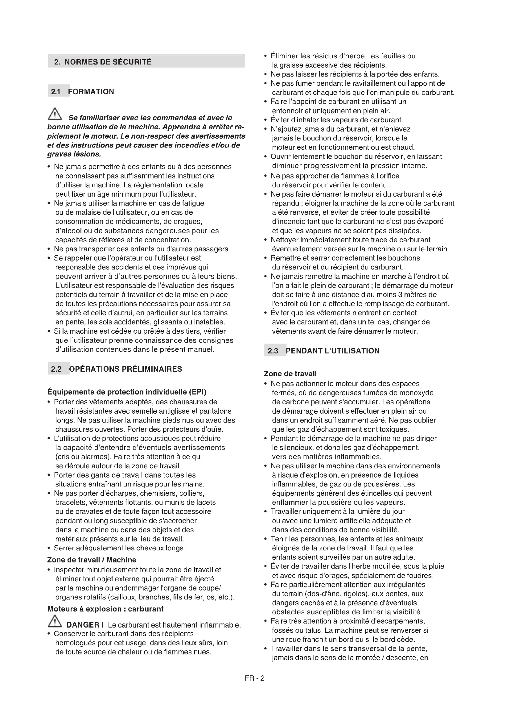 - Inspecter minutieusement toute la zone de travail et éliminer tout objet externe qui pourrait être éjecté par la machine ou endommager l'organe de coupe/ organes rotatifs (cailloux, branches, ls de fer, os, etc.). Moteurs à explosion : carburant DANGER ! Le carburant est hautement inammable.