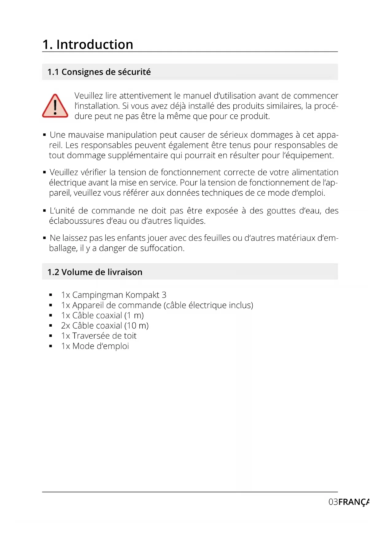 Une mauvaise manipulation peut causer de sérieux dommages à cet appa- reil. Les responsables peuvent également être tenus pour responsables de tout dommage supplémentaire qui pourrait en résulter pour l‘équipement. Veuillez vérier la tension de fonctionnement correcte de votre alimentation électrique avant la mise en service. Pour la tension de fonctionnement de l‘ap- pareil, veuillez vous référer aux données techniques de ce mode d‘emploi. L‘unité de commande ne doit pas être exposée à des gouttes d‘eau, des éclaboussures d‘eau ou d‘autres liquides. Ne laissez pas les enfants jouer avec des feuilles ou d‘autres matériaux d‘em- ballage, il y a danger de suocation. 1x Campingman Kompakt 3 1x Appareil de commande (câble électrique inclus) 1x Câble coaxial (1 m) 2x Câble coaxial (10 m) 1x Traversée de toit 1x Mode d‘emploi04 FRANÇAIS