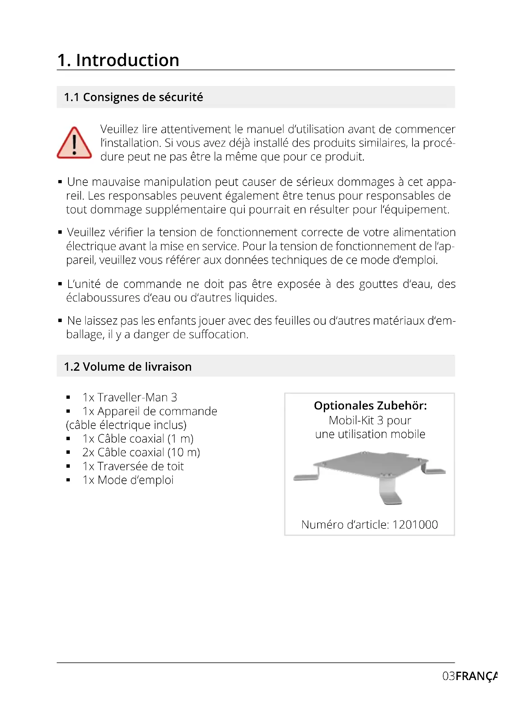 Une mauvaise manipulation peut causer de sérieux dommages à cet appa- reil. Les responsables peuvent également être tenus pour responsables de tout dommage supplémentaire qui pourrait en résulter pour l‘équipement. Veuillez vérier la tension de fonctionnement correcte de votre alimentation électrique avant la mise en service. Pour la tension de fonctionnement de l‘ap- pareil, veuillez vous référer aux données techniques de ce mode d‘emploi. L‘unité de commande ne doit pas être exposée à des gouttes d‘eau, des éclaboussures d‘eau ou d‘autres liquides. Ne laissez pas les enfants jouer avec des feuilles ou d‘autres matériaux d‘em- ballage, il y a danger de suocation. 1x Traveller-Man 3 1x Appareil de commande (câble électrique inclus) 1x Câble coaxial (1 m) 2x Câble coaxial (10 m) 1x Traversée de toit 1x Mode d‘emploi Optionales Zubehör: Mobil-Kit 3 pour une utilisation mobile Numéro d’article: 120100004 FRANÇAIS