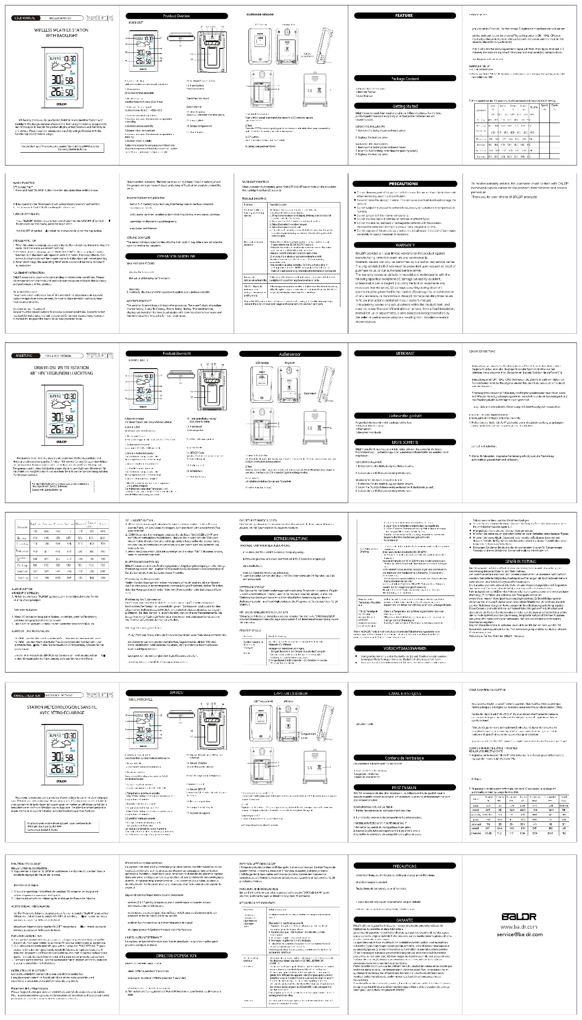 Nous vous remercions par la présente d'avoir acheté la station météorologique sans fil Baldr avec rétroéclairage. Nous concevons et fabriquons l'article à l'aide de composants et de techniques innovants pour permettre un affichage parfait de la température et de l'humidité dans un seul appareil. Veuillez lire attentivement le mode d'emploi et vous familiariser avec les fonctions avant de l'utiliser. Pour la mise en service de cet appareil, vous avez besoin de : Unité principale par 2 piles AAACapteur par 2xAAA Batteries APERÇU 1. Affichage du calendrieravec mois/date ou date/mois sélectionnable2. Heure actuelleFormat 12/24 heures sélectionnable3. Prévisions météoPrévisions météorologiques pour les 12-24 prochaines heures4. Canal de capteur extérieurCanal de commutation de CH1--CH2-CH35. Température extérieure actuelleL'icône flèche indique la direction dans laquelle la température est orientée.6. Humidité extérieure actuelle10. Bouton Rétroéclairage/Réductio n du bruit11. Bouton d'alarme Vérifier l'heure de l'alarme1. Commutateur du canal 1-2-3Le canal de l'unité principale doit correspondre au commutateur 1-2-3 du capteur pour assurer la synchronisation.