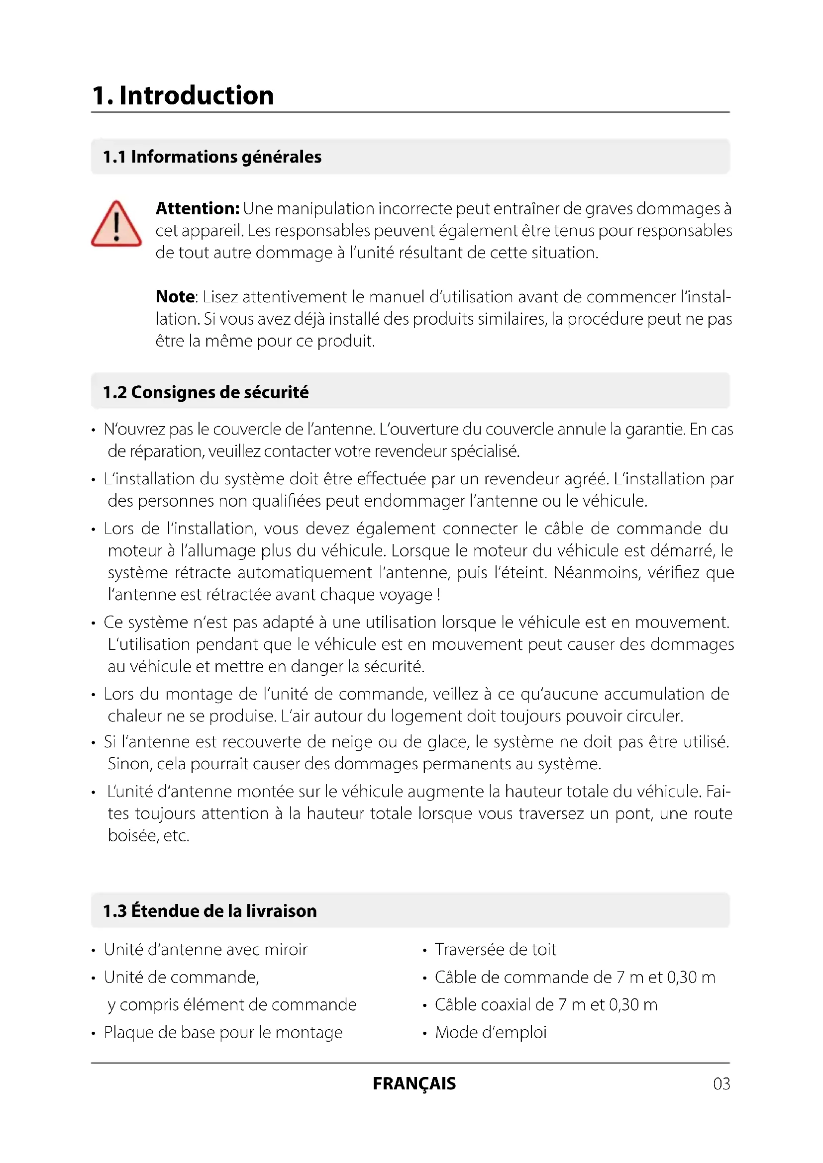 - L‘installation du système doit être eectuée par un revendeur agréé. L‘installation par des personnes non qualiées peut endommager l‘antenne ou le véhicule.