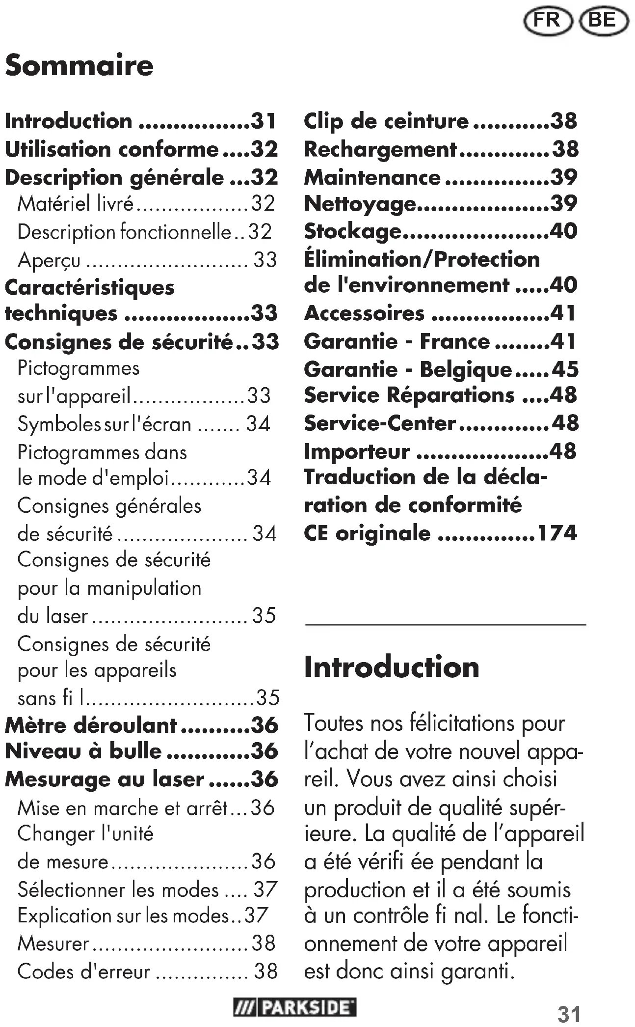 - Importeur FR BE La notice d’utilisation fait partie de ce pro- duit. Elle contient des instructions importantes pour la sécurité, l’utilisation et l’élimination des déchets. Avant d’utiliser ce produit, lisez attentivement les con- signes d’emploi et de sécuri- té. N’utilisez le produit que tel que décrit et uniquement pour les domaines d’emploi indiqués. Conservez cette notice et remettez-la avec tous les documents si vous cédez le produit à un tiers. Utilisation conforme Le mètre ruban avec laser et niveau à bulle sert à mesurer des distances. L’appareil est destiné à être utilisé par des adultes. L'opérateur ou l'utilisateur est responsable des accidents ou des dommages causés aux autres personnes ou à leurs biens. Le fabricant ne peut être tenu pour res- ponsable des dommages causés par une utilisation inappropriée ou par une manipulation incorrecte. Cet appareil n'est pas conçu pour une utilisation commerciale. Une utilisa- tion commerciale annule la garantie. L’appareil peut être utilisé exclusivement dans des locaux secs. Description générale Vous trouverez les représenta- tions sur le volet rabattable. Matériel livré Déballez l'appareil et contrôlez s'il est au complet. - Télémètre laser avec mètre ruban - Câble de recharge USB-C - Mode d'emploi Recyclez correctement les matériaux d’emballage. Description fonctionnelle Pour savoir quelles fonc- tions remplissent les éléments de commande,33 BEFR veuillez vous reporter aux descriptions suivantes. Aperçu 1 Bulle 2 Écran 3 Touche "Mode" 4 Touche "Laser" 5 Clip de ceinture 6 Prise de charge 7 Câble de charge USB-C 8 Fiche USB 9 Fiche USB-C 10 Mètre déroulant 11 Touche de déverrouillage 12 Ori ce de sortie du laser Caractéristiques techniques Mètre ruban à piles PLMB 4 B1 Tension de service p. 4832