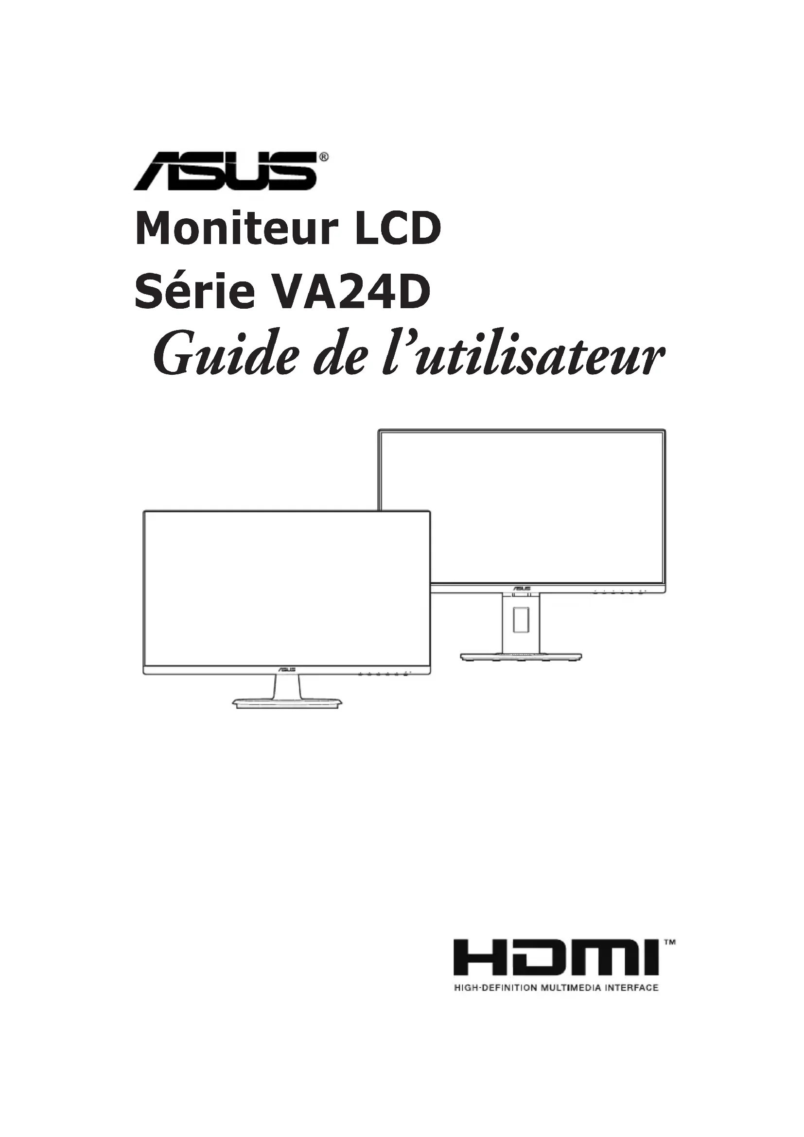 Moniteur LCD Série VA24D Guide de l’utilisateurii Première édition Octobre 2019 Copyright © 2019 ASUSTeK COMPUTER INC. Tous droits réservés. Aucune partie de cette publication, y compris les produits et logiciels y étant décrits, ne peut être reproduite, transmise, transcrite, stockée dans un système d’interrogation ou traduite dans une langue quelconque sous quelque forme et par quelque moyen que ce soit, exception faite de la documentation conservée par l’acheteur à des ns de sauvegarde, sans l’autorisation écrite expresse de ASUSTeK COMPUTER INC. (« ASUS »). La garantie du produit ou service ne sera pas prolongée si : (1) le produit est réparé, modié ou altéré, à moins que ladite réparation, modication ou altération soit autorisée par écrit par ASUS ; ou (2) si le numéro de série du produit soit déguré ou manquant. ASUS FOURNIT CE MANUEL TEL QUEL SANS GARANTIE QUELLE QU’ELLE SOIT, EXPRESSE OU IMPLICITE, Y COMPRIS SANS LIMITATION, TOUTE GARANTIE OU CONDITION IMPLICITE DE QUALITE MARCHANDE OU DE COMPATIBILITE A DES FINS PARTICULIERES. EN AUCUN CAS ASUS, SES DIRECTEURS, MEMBRES DE LA DIRECTION, EMPLOYES OU AGENTS NE SAURONT ETRE TENUS POUR RESPONSABLES DE DOMMAGES INDIRECTS, SPECIAUX, CIRCONSTANCIELS OU CONSEQUENTS (Y COMPRIS LES DOMMAGES POUR PERTES DE PROFIT, PERTE D’UTILISATION, D’INSTALLATION OU D’EQUIPEMENT, ARRET D’ACTIVITE ET SIMILAIRE), MEME SI ASUS A ETE AVISEE DE LA POSSIBILITE DE TELS DOMMAGES DECOULANT DE TOUT DEFAUT OU D’ERREUR CONTENU DANS LE PRESENT MANUEL OU PRODUIT. LES SPECIFICATIONS ET LES INFORMATIONS CONTENUES DANS LE PRESENT MANUEL SONT FOURNIS A TITRE D’INFORMATION UNIQUEMENT ET SONT SOUS RESERVE DE CHANGEMENT A TOUT MOMENT SANS PREAVIS ET NE DOIVENT PAS ETRE INTERPRETEES COMME UN ENGAGEMENT DE LA PART D’ASUS. ASUS N’ENDOSSE AUCUNE RESPONSABILITE OU ENGAGEMENT POUR DES ERREURS OU DES INEXACTITUDES QUI PEUVENT APPARAITRE DANS LE PRESENT MANUEL, Y COMPRIS LES PRODUITS ET LOGICIELS QUI Y SONT DECRITS. Les noms de produits et raisons sociales qui apparaissent dans le présent manuel peuvent ou non être des marques commerciales ou droits d’auteurs enregistrés de leurs sociétés respectives et ne sont utilisés qu’à titre d’identication et d’explication et au bénéce de leurs propriétaires, sans intention de contrevenance.iii Table des matières Table des matières ..................................................................................... iii Avertissements ........................................................................................... iv Informations de sécurité ............................................................................ vi Soin & Nettoyage ....................................................................................... vii Takeback Services .................................................................................... viii