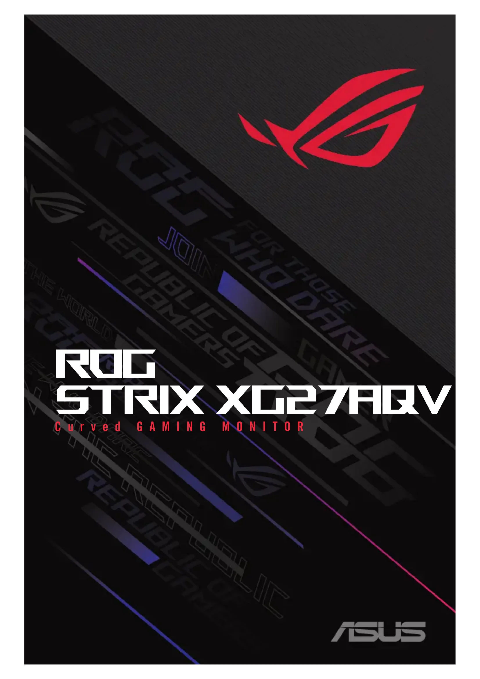 Curved GAMING MONITOR ROG strix XG27AQVii Copyright © 2022 ASUSTeK COMPUTER INC. Tous droits réservés. Aucune partie de ce manuel, y compris les produits et le logiciel décrit dans ce document, ne peut être reproduite, transmise, transcrite, stockée dans un système d'extraction ou traduite dans une langue quelconque sous quelque forme et par quelque moyen que ce soit à l'exception de la documentation conservée par l'acheteur à des ns de sauvegarde, sans l'autorisation écrite expresse de ASUSTeK COMPUTER INC. ("ASUS"). La garantie du produit ou service ne sera pas prolongée si : (1) le produit a été réparé, modié ou altéré, sauf si les réparations, modications ou altérations ont été autorisées par écrit par ASUS; ou (2) si le numéro de série du produit a été effacé ou n’est plus lisible. ASUS FOURNIT CE MANUEL TEL QUEL SANS GARANTIE QUELLE QU’ELLE SOIT, EXPRESSE OU IMPLICITE, Y COMPRIS SANS LIMITATION, TOUTE GARANTIE OU CONDITION IMPLICITE DE QUALITE MARCHANDE OU DE COMPATIBILITE A DES FINS PARTICULIERES. EN AUCUN CAS ASUS, SES DIRECTEURS, MEMBRES DE LA DIRECTION, EMPLOYEÉS OU AGENTS NE SAURAIENT ÊTRE TENUS POUR RESPONSABLES DE DOMMAGES INDIRECTS, SPÉCIAUX, CIRCONSTANCIELS OU CONSÉCUTIFS (Y COMPRIS LES DOMMAGES POUR MANQUE À GAGNER, PERTES COMMERCIALES, PERTE DE JOUISSANCE OU DE DONNÉES, INTERRUPTION D’EXPLOITATION ET AUTRES), MÊME SI ASUS A ÉTÉ AVISÉE DE LA POSSIBILITÉ DE TELS DOMMAGES DÉCOULANT DE TOUT DÉFAUT OU D’ERREUR CONTENUE DANS LE PRÉSENT MANUEL OU PRODUIT. LES SPÉCIFICATIONS ET LES INFORMATIONS CONTENUES DANS CE MANUEL SONT FOURNIES À TITRE D’INFORMATION UNIQUEMENT ET SONT SOUS RÉSERVE DE CHANGEMENT À TOUT MOMENT SANS PRÉAVIS. ELLES NE DOIVENT PAS ÊTRE INTERPRETEES COMME UN ENGAGEMENT DE LA PART D’ASUS. ASUS N’ENDOSSE AUCUNE RESPONSABILITÉ OU NI AUCUN ENGAGEMENT POUR DES ERREURS OU DES INEXACTITUDES QUI PEUVENT APPARAITRE DANS LE PRÉSENT MANUEL, Y COMPRIS LES PRODUITS ET LOGICIELS QUI Y SONT DÉCRITS. Les noms de produits et d'entreprises qui apparaissent dans le présent manuel peuvent ou non être des marques commerciales ou droits d’auteurs enregistrés de leurs sociétés respectives et ne sont utilisés qu’à titre d’identication et d’explication et au bénéce de leurs propriétaires, sans intention de contrevenance. Première édition Octobre 2022iii Table des matières Avertissements ................................................iv Informations de sécurité .................................v Soin & Nettoyage .......................................... viii