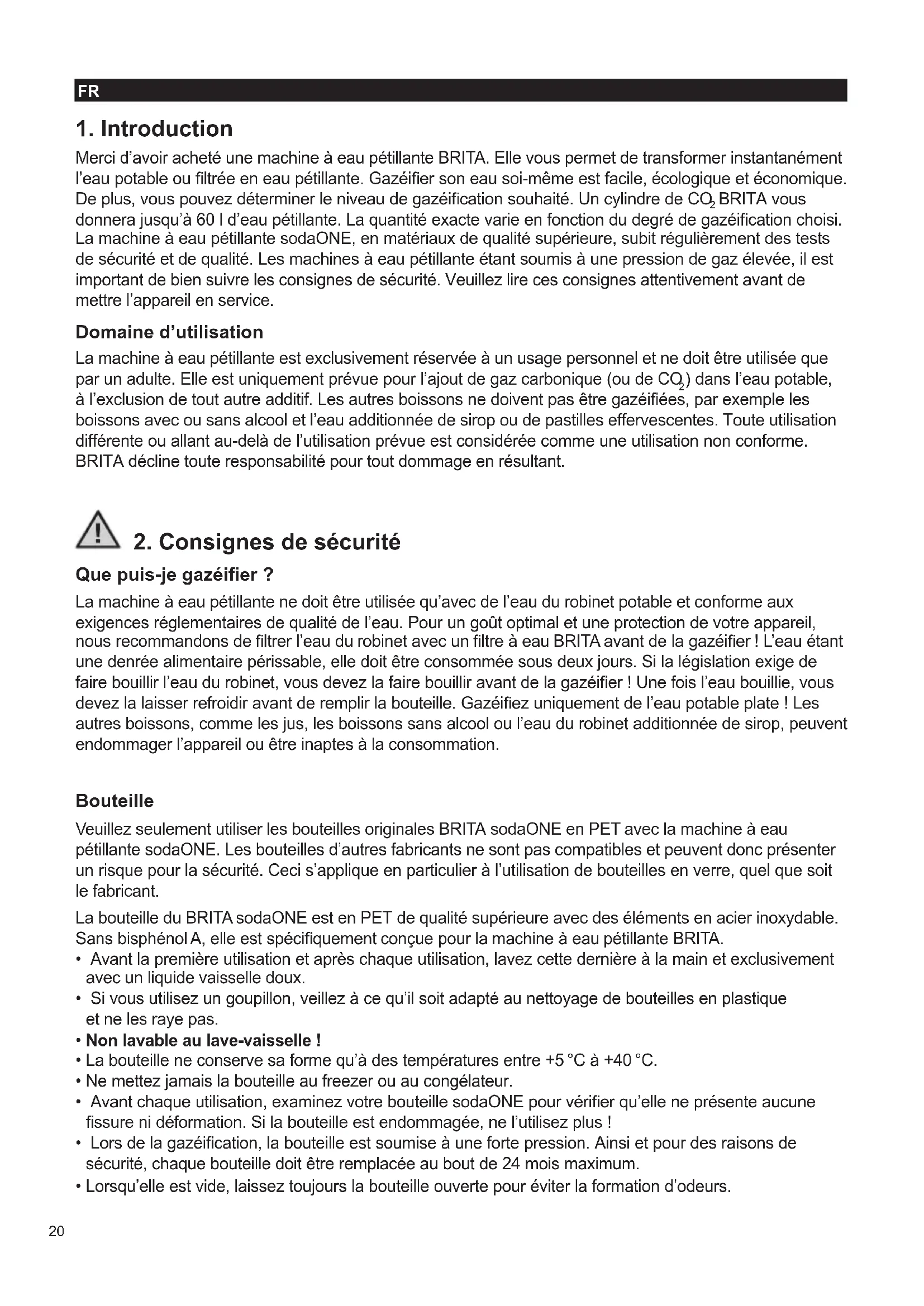 BRITA vous donnera jusqu’à 60 l d’eau pétillante. La quantité exacte varie en fonction du degré de gazéication choisi. La machine à eau pétillante sodaONE, en matériaux de qualité supérieure, subit régulièrement des tests de sécurité et de qualité. Les machines à eau pétillante étant soumis à une pression de gaz élevée, il est important de bien suivre les consignes de sécurité. Veuillez lire ces consignes attentivement avant de mettre l’appareil en service. Domaine d’utilisation La machine à eau pétillante est exclusivement réservée à un usage personnel et ne doit être utilisée que par un adulte. Elle est uniquement prévue pour l’ajout de gaz carbonique (ou de CO