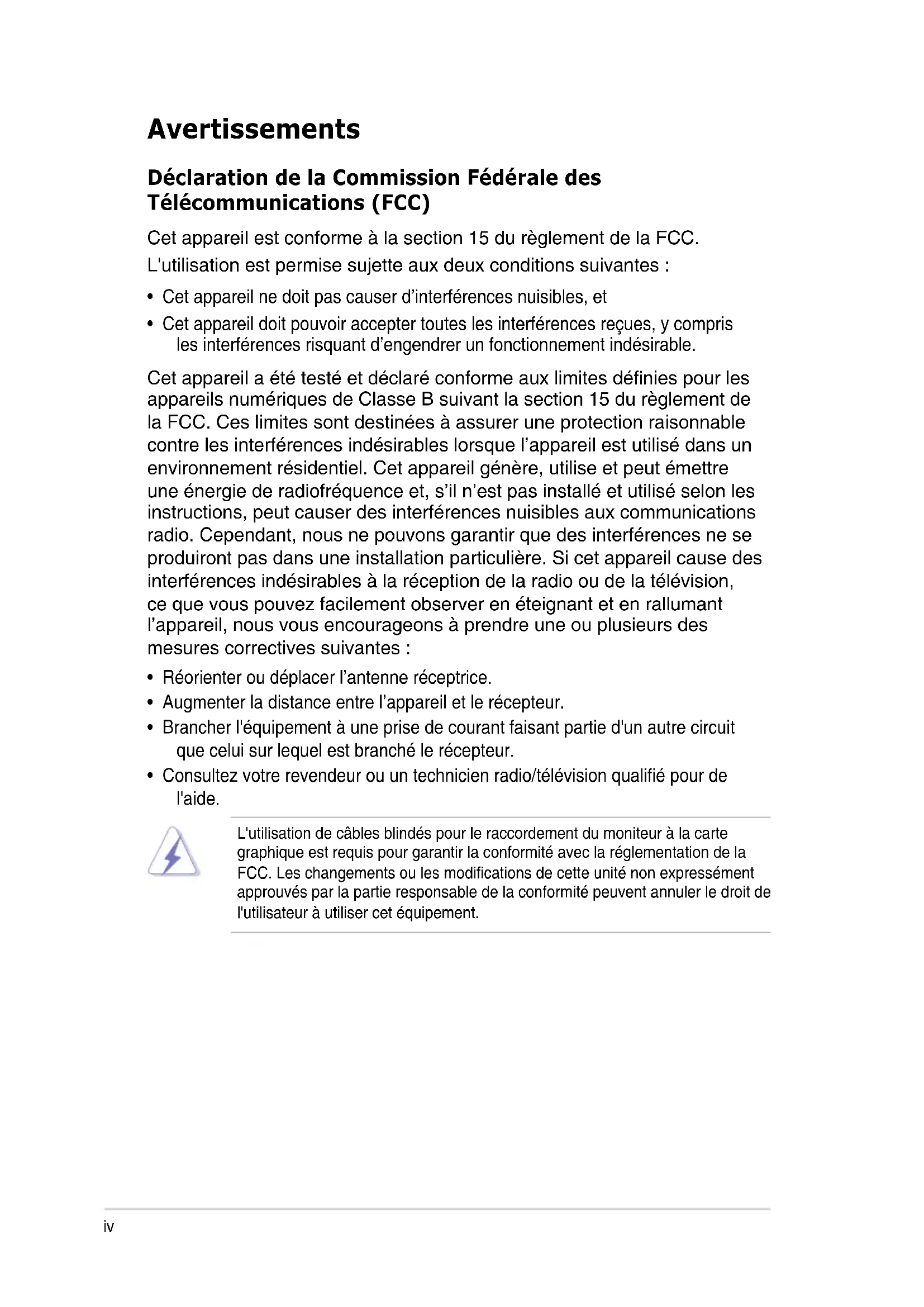 Avertissements Déclaration de la Commission Fédérale des Télécommunications (FCC) Cet appareil est conforme à la section 15 du règlement de la FCC. L'utilisation est permise sujette aux deux conditions suivantes :