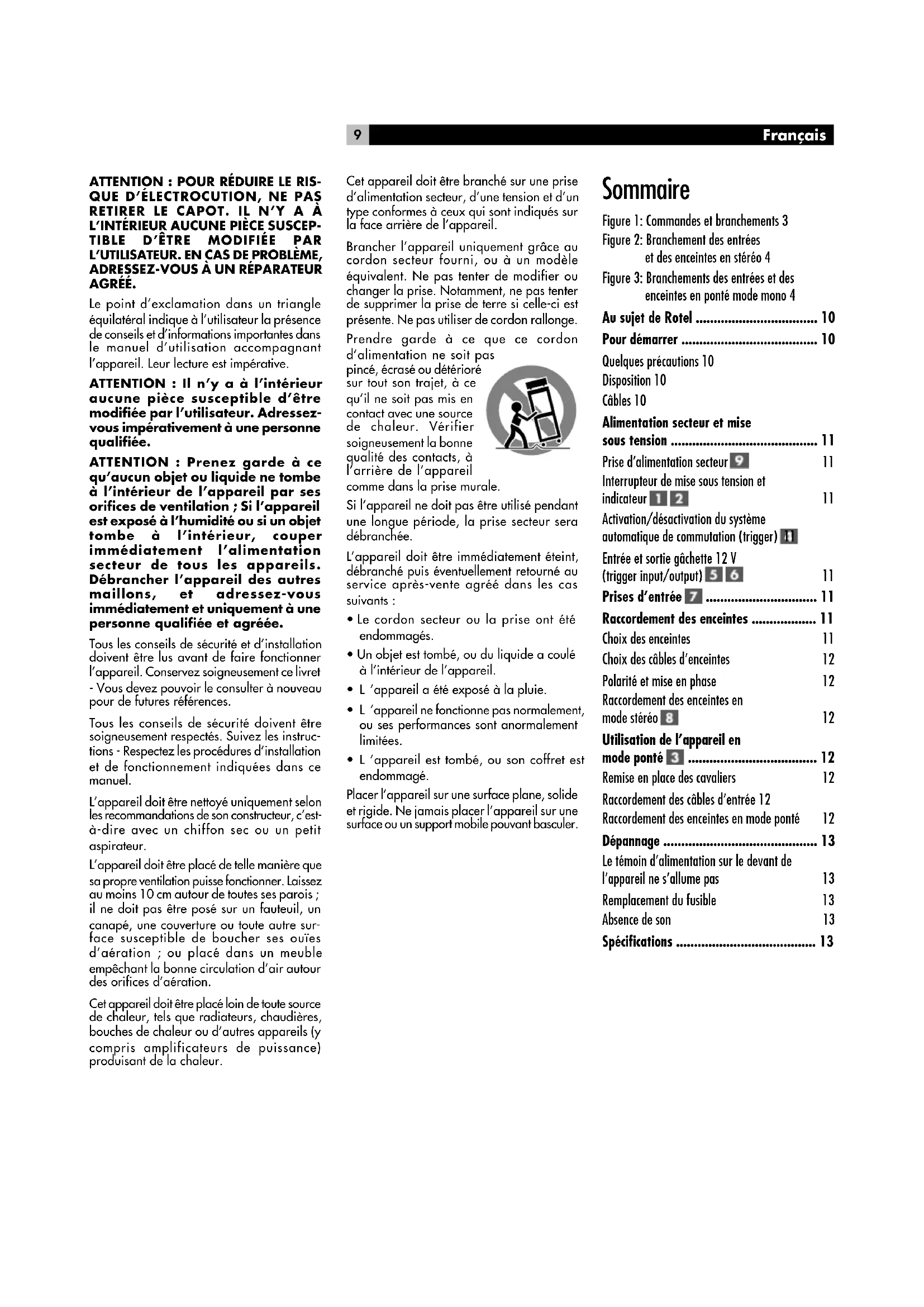 AGRÉÉ. Le point d’exclamation dans un triangle équilatéral indique à l’utilisateur la présence de conseils et d’informations importantes dans le manuel d’utilisation accompagnant l’appareil. Leur lecture est impérative. ATTENTION : Il n’y a à l’intérieur aucune pièce susceptible d’être modifiée par l’utilisateur. Adressez- vous impérativement à une personne qualifiée. ATTENTION : Prenez garde à ce qu’aucun objet ou liquide ne tombe à l’intérieur de l’appareil par ses orifices de ventilation ; Si l’appareil est exposé à l’humidité ou si un objet tombe à l’intérieur, couper immédiatement l’alimentation secteur de tous les appareils. Débrancher l’appareil des autres maillons, et adressez-vous immédiatement et uniquement à une personne qualifiée et agréée. Tous les conseils de sécurité et d’installation doivent être lus avant de faire fonctionner l’appareil. Conservez soigneusement ce livret - Vous devez pouvoir le consulter à nouveau pour de futures références. Tous les conseils de sécurité doivent être soigneusement respectés. Suivez les instruc- tions - Respectez les procédures d’installation et de fonctionnement indiquées dans ce manuel. L’appareil doit être nettoyé uniquement selon les recommandations de son constructeur, c’est- à-dire avec un chiffon sec ou un petit aspirateur. L’appareil doit être placé de telle manière que sa propre ventilation puisse fonctionner. Laissez au moins 10 cm autour de toutes ses parois ; il ne doit pas être posé sur un fauteuil, un canapé, une couverture ou toute autre sur- face susceptible de boucher ses ouïes d’aération ; ou placé dans un meuble empêchant la bonne circulation d’air autour des orifices d’aération. Cet appareil doit être placé loin de toute source de chaleur, tels que radiateurs, chaudières, bouches de chaleur ou d’autres appareils (y compris amplificateurs de puissance) produisant de la chaleur. Cet appareil doit être branché sur une prise d’alimentation secteur, d’une tension et d’un type conformes à ceux qui sont indiqués sur la face arrière de l’appareil. Brancher l’appareil uniquement grâce au cordon secteur fourni, ou à un modèle équivalent. Ne pas tenter de modifier ou changer la prise. Notamment, ne pas tenter de supprimer la prise de terre si celle-ci est présente. Ne pas utiliser de cordon rallonge. Prendre garde à ce que ce cordon d’alimentation ne soit pas pincé, écrasé ou détérioré sur tout son trajet, à ce qu’il ne soit pas mis en contact avec une source de chaleur. Vérifier soigneusement la bonne qualité des contacts, à l’arrière de l’appareil comme dans la prise murale. Si l’appareil ne doit pas être utilisé pendant une longue période, la prise secteur sera débranchée. L’appareil doit être immédiatement éteint, débranché puis éventuellement retourné au service après-vente agréé dans les cas suivants :