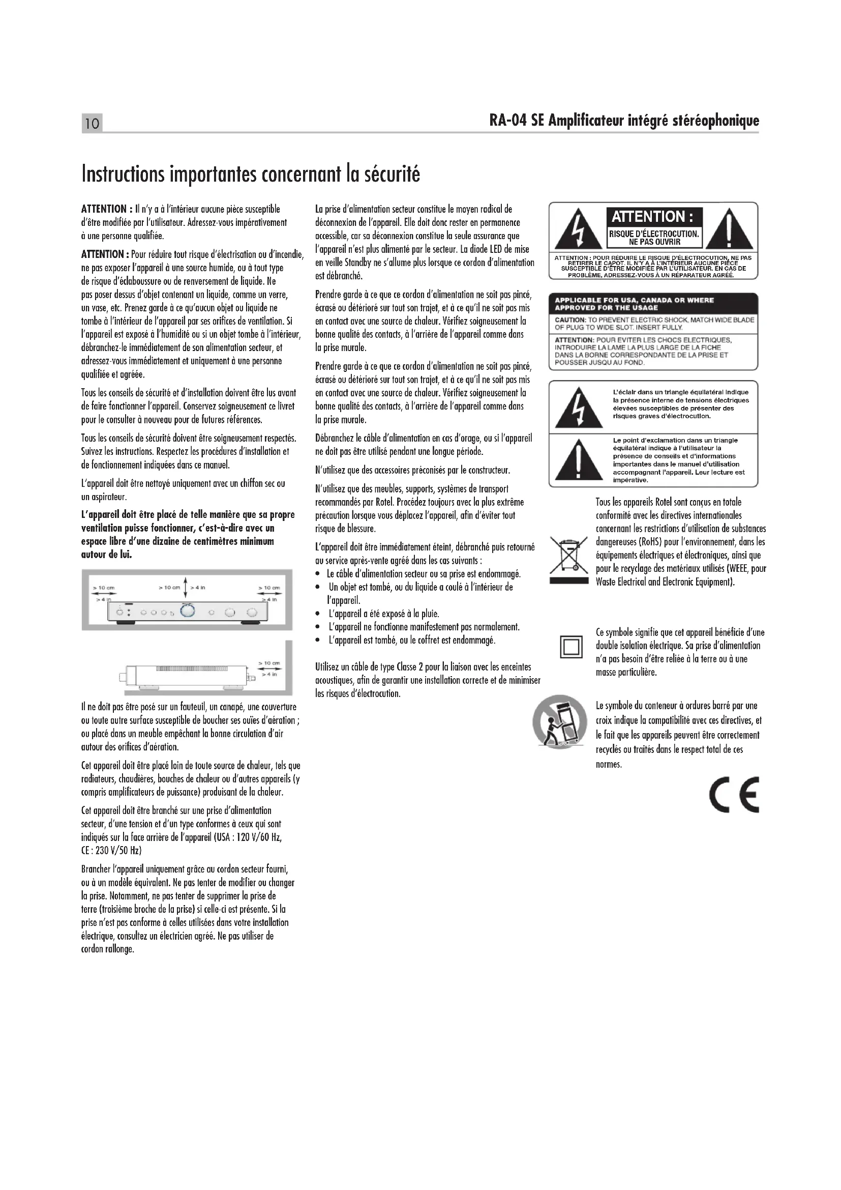 - L’appareilesttombé,oulecoffretestendommagé. Utilisez un câble de type Classe 2 pour la liaison avec les enceintes acoustiques, afin de garantir une installation correcte et de minimiser les risques d’électrocution. ATTENTION : Il n’y a à l’intérieur aucune pièce susceptible d’être modifiée par l’utilisateur. Adressez-vous impérativement à une personne qualifiée. ATTENTION : Pour réduire tout risque d’électrisation ou d’incendie, ne pas exposer l’appareil à une source humide, ou à tout type de risque d’éclaboussure ou de renversement de liquide. Ne pas poser dessus d’objet contenant un liquide, comme un verre, un vase, etc. Prenez garde à ce qu’aucun objet ou liquide ne tombe à l’intérieur de l’appareil par ses orifices de ventilation. Si l’appareil est exposé à l’humidité ou si un objet tombe à l’intérieur, débranchez-le immédiatement de son alimentation secteur, et adressez-vous immédiatement et uniquement à une personne qualifiée et agréée. Tous les conseils de sécurité et d’installation doivent être lus avant de faire fonctionner l’appareil. Conservez soigneusement ce livret pour le consulter à nouveau pour de futures références. Tous les conseils de sécurité doivent être soigneusement respectés. Suivez les instructions. Respectez les procédures d’installation et de fonctionnement indiquées dans ce manuel. L’appareil doit être nettoyé uniquement avec un chiffon sec ou un aspirateur. L’appareil doit être placé de telle manière que sa propre ventilation puisse fonctionner, c’est-à-dire avec un espace libre d’une dizaine de centimètres minimum autour de lui. Il ne doit pas être posé sur un fauteuil, un canapé, une couverture ou toute autre surface susceptible de boucher ses ouïes d’aération ; ou placé dans un meuble empêchant la bonne circulation d’air autour des orifices d’aération. Cet appareil doit être placé loin de toute source de chaleur, tels que radiateurs, chaudières, bouches de chaleur ou d’autres appareils (y compris amplificateurs de puissance) produisant de la chaleur. Cet appareil doit être branché sur une prise d’alimentation secteur, d’une tension et d’un type conformes à ceux qui sont indiqués sur la face arrière de l’appareil (USA : 120 V/60 Hz, CE : 230 V/50 Hz) Brancher l’appareil uniquement grâce au cordon secteur fourni, ou à un modèle équivalent. Ne pas tenter de modifier ou changer la prise. Notamment, ne pas tenter de supprimer la prise de terre (troisième broche de la prise) si celle-ci est présente. Si la prise n’est pas conforme à celles utilisées dans votre installation électrique, consultez un électricien agréé. Ne pas utiliser de cordon rallonge. Tous les appareils Rotel sont conçus en totale conformité avec les directives internationales concernant les restrictions d’utilisation de substances dangereuses (RoHS) pour l’environnement, dans les équipements électriques et électroniques, ainsi que pour le recyclage des matériaux utilisés (WEEE, pour Waste Electrical and Electronic Equipment). Instructions importantes concernant la sécurité Ce symbole signifie que cet appareil bénéficie d’une double isolation électrique. Sa prise d’alimentation n’a pas besoin d’être reliée à la terre ou à une masse particulière. Le symbole du conteneur à ordures barré par une croix indique la compatibilité avec ces directives, et le fait que les appareils peuvent être correctement recyclés ou traités dans le respect total de ces normes. ATTENTION : RISQUE D’ÉLECTROCUTION. NE PAS OUVRIRATTENTION : POUR RÉDUIRE LE RISQUE D’ÉLECTROCUTION, NE PA S RETIRER LE CAPOT. IL N’Y A À L’ INTÉRIEUR AUCUNE PIÈCE SUSCEPTIBLE D'ÊTRE MODIFIÉE PA R L’ UTILISATEUR. EN CAS DE PROBLÈME, ADRESSEZ-VOUS À UN RÉPARATEUR AGRÉÉ. L’ éclair dans un triangle équilatéral indique la présence interne de tensions électriques élevées susceptibles de présenter des risques graves d’électrocution.Le point d’exclamation dans un triangle équilatéral indique à l’utilisateur la présence de conseils et d’informations importantes dans le manuel d’utilisation accompagnant l’appareil. Leur lecture est impérative.11 Français Au sujet de Rotel Notre histoire commence il y a près de 50 ans. Depuis, au fil des années, nous avons reçu des centaines de prix et de récompenses, et satisfait des centaines de milliers de personnes – comme vous ! Rotel a été fondée par une famille passionnée de musique, qui a décidé de fabriquer des maillons Haute Fidélité sans compromis aucun. Depuis sa création, cette passion est restée intacte, et cette famille s’est fixée comme objectif de proposer à tous les audiophiles et mélomanes les meilleurs appareils possibles, quel que soit leur budget. Une volonté partagée par tous les employés de Rotel. Les ingénieurs Rotel travaillent selon une équipe très soudée, écoutant, peaufinant chaque nouveau modèle jusqu’à ce qu’il atteigne exactement leurs standards – très élevés – de musicalité. Ils sont libres de choisir des composants en provenance du monde entier, afin de concevoir le produit le meilleur possible. C’est ainsi que vous trouverez dans nos appareils des condensateurs d’origine britannique ou allemande, des transistors japonais ou américains, tandis que les transformateurs toriques sont toujours fabriqués dans nos propres usines Rotel. Nous sommes tous concernés par la qualité de l’environnement. Et, comme de plus en plus de produits électroniques sont fabriqués puis éliminés quelques années plus tard, il est désormais essentiel qu’un constructeur fabrique tous ses produits en veillant à ce qu’ils aient un impact minimum sur la terre et les nappes phréatiques. Chez Rotel, nous sommes très fiers d’apporter notre pierre à ce nouvel édifice. Nous avons réduit la teneur en plomb de nos électroniqu