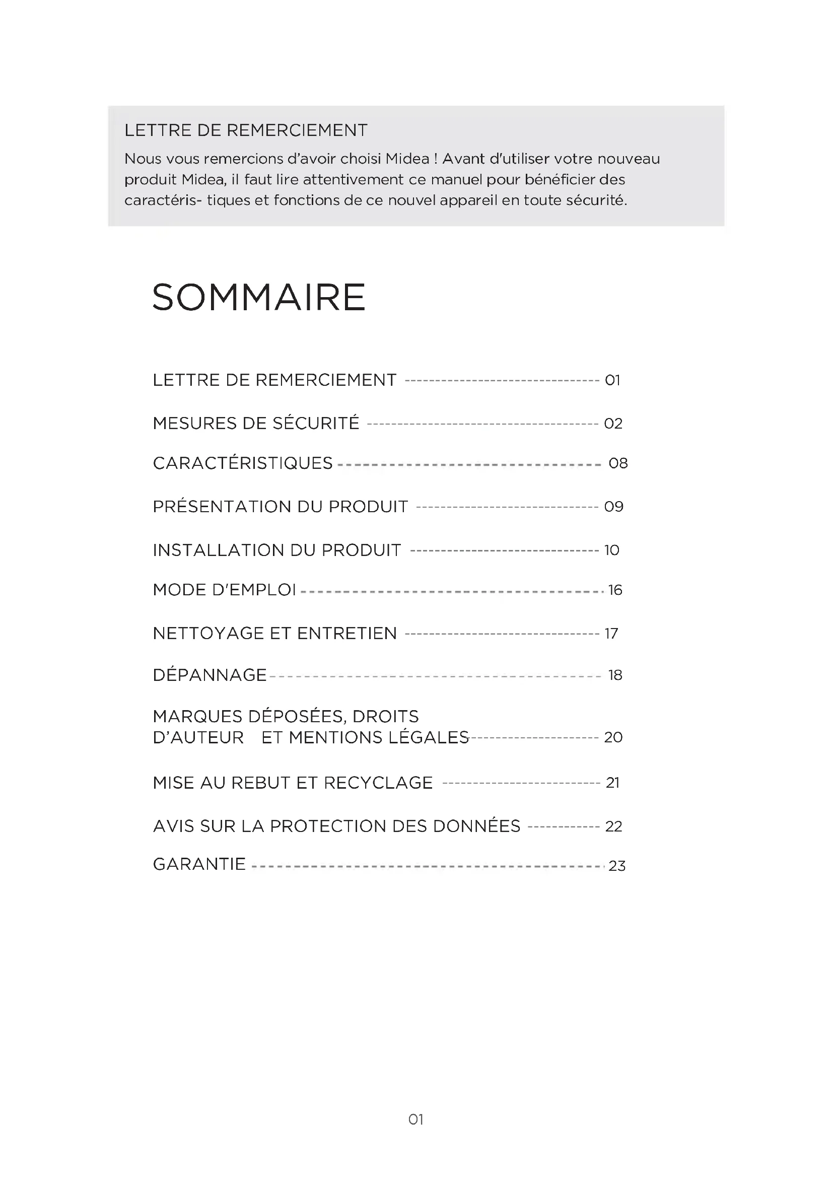 LÉGALES Le logo , les marques verbales, le nom commercial, la présentation et toutes les versions de ces éléments sont des propriétés précieuses de Midea Group ou de ses sociétés affiliées (« Midea »), auxquelles sont rattachés des marques, des droits d’auteur et d’autres droits de propriété intellectuelle, ainsi que toute bonne volonté résultant de l’utilisation d’une partie quelconque de la marque Midea.L’utilisation de la marque Midea à des fins commerciales sans le consentement écrit préalable de Midea peut constituer une violation de la marque ou une concurrence déloyale en violation des lois pertinentes. Ce manuel a été rédigé par Midea et Midea se réserve tous les droits d’auteur. Aucun individu ou entité ne peut utiliser, dupliquer, modifier, distribuer en totalité ou en partie ce manuel, ni le regrouper ou le vendre avec d’autres produits sans le consentement écrit préalable de Midea. Toutes les fonctions et instructions qui y sont décrites étaient à jour au moment de l’impression de ce manuel. Toutefois, le produit réel peut varier en raison de l’amélioration des fonctions et de la conception.