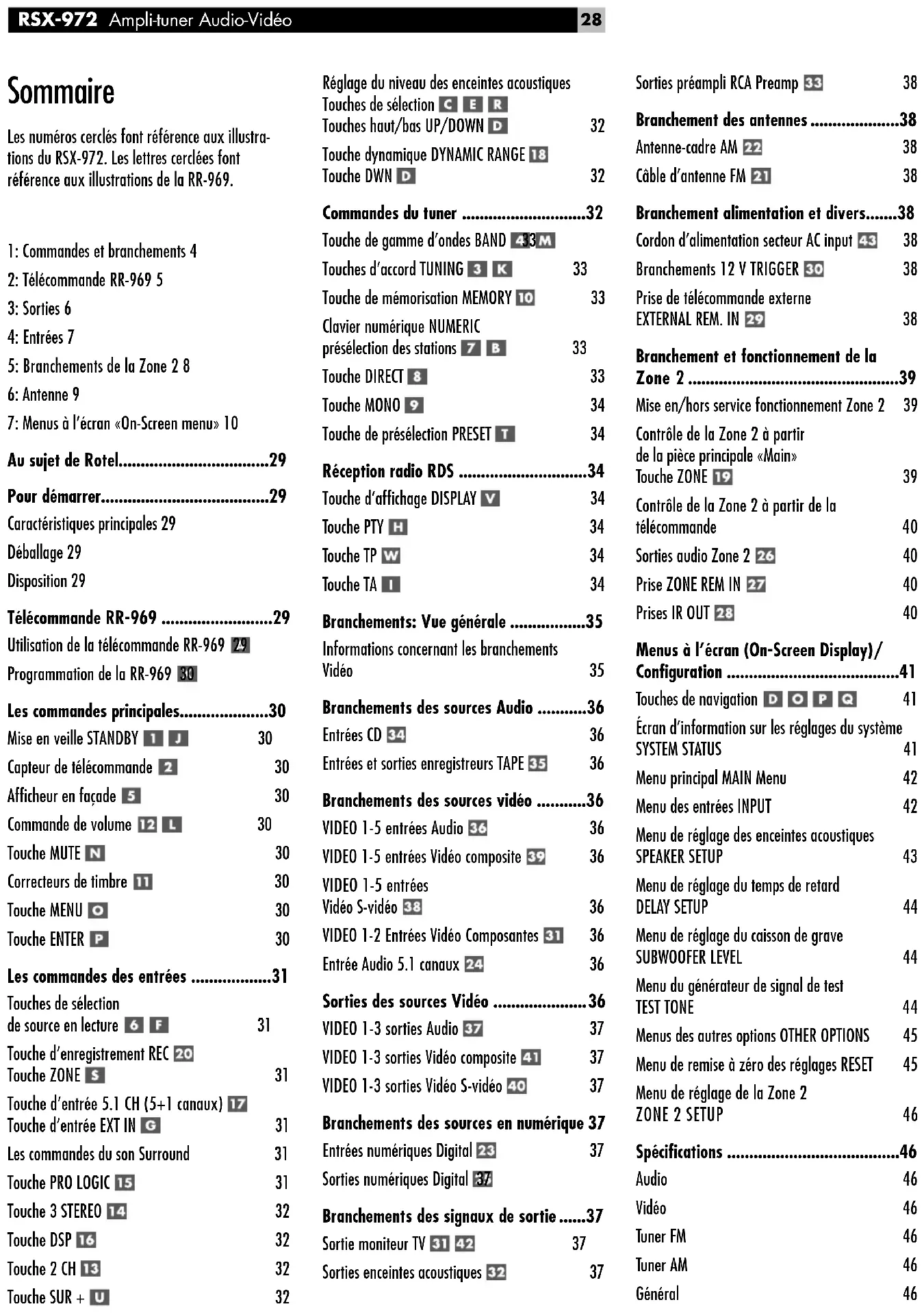 - Signal to Noise Ratio (at 65 dBf) 70 dBf Harmonic Distortion (at 65 dBf) 0.03% Stereo Separation (1 kHz) 45 dB Output level 1 V Antenna Input 75 ohms unbalanced English28 Sommaire Les numéros cerclés font référence aux illustra- tions du RSX-972. Les lettres cerclées font référence aux illustrations de la RR-969. RSX-972 Ampli-tuner Audio-Vidéo 1: Commandes et branchements 4 2: Télécommande RR-969 5 3: Sorties 6 4: Entrées 7 5: Branchements de la Zone 2 8 6: Antenne 9 7: Menus à l’écran «On-Screen menu» 10 Au sujet de Rotel p. 29