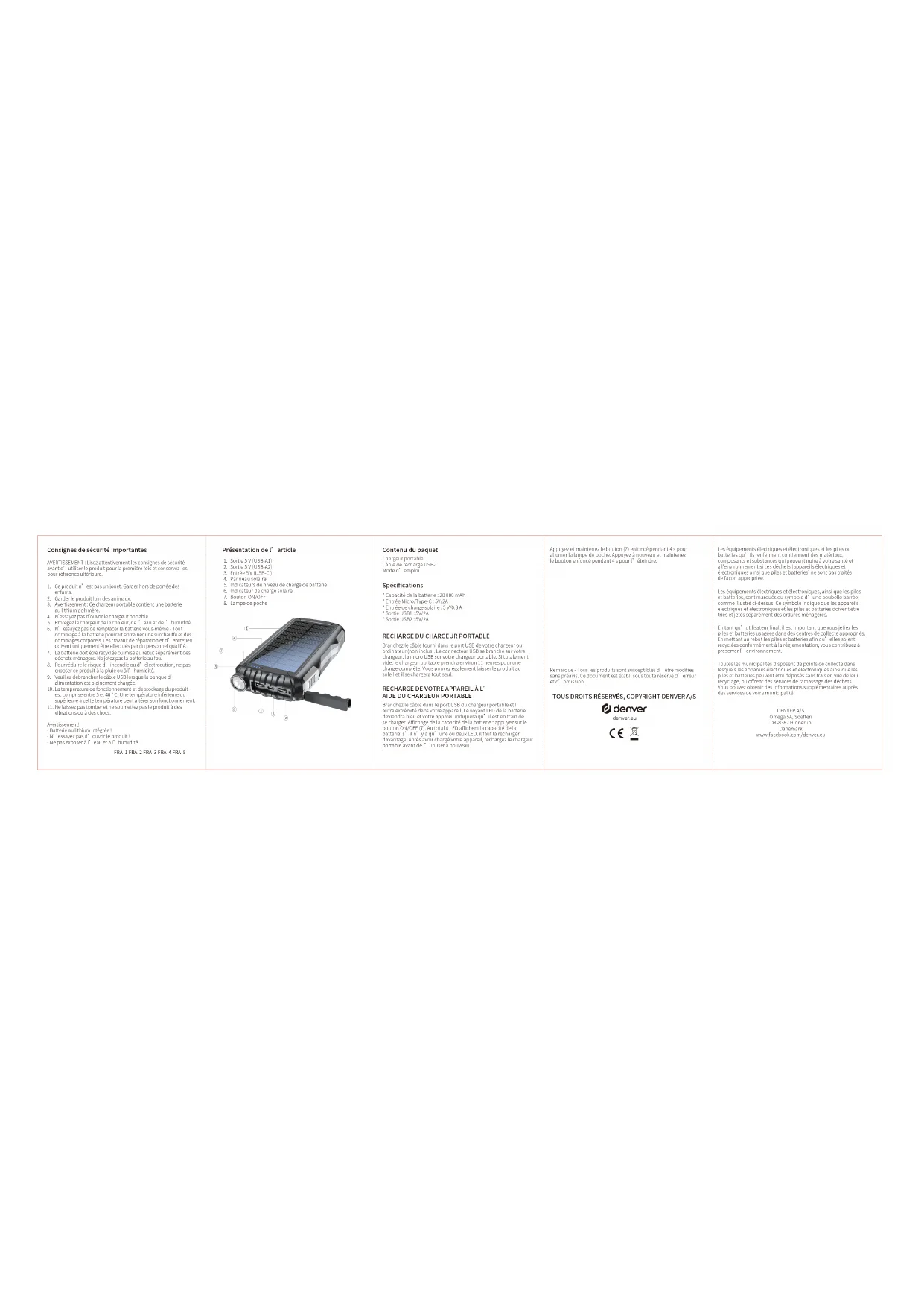 au lithium polymère. N'essayez pas d'ouvrir le chargeur portable. Protégez le chargeur de la chaleur, de l’eau et de l’humidité. N’essayez pas de remplacer la batterie vous-même - Tout dommage à la batterie pourrait entraîner une surchauffe et des dommages corporels. Les travaux de réparation et d’entretien doivent uniquement être effectués par du personnel qualifié. La batterie doit être recyclée ou mise au rebut séparément des déchets ménagers. Ne jetez pas la batterie au feu. Pour réduire le risque d’incendie ou d’électrocution, ne pas exposer ce produit à la pluie ou à l’humidité. Veuillez débrancher le câble USB lorsque la banque d’ alimentation est pleinement chargée. La température de fonctionnement et de stockage du produit est comprise entre 5 et 40 ° C. Une température inférieure ou supérieure à cette température peut altérer son fonctionnement. Ne laissez pas tomber et ne soumettez pas le produit à des vibrations ou à des chocs. TOUS DROITS RÉSERVÉS, COPYRIGHT DENVER A/S Appuyez et maintenez le bouton (7) enfoncé pendant 4 s pour allumer la lampe de poche. Appuyez à nouveau et maintenez le bouton enfoncé pendant 4 s pour l’éteindre. Remarque - Tous les produits sont susceptibles d’être modifiés sans préavis. Ce document est établi sous toute réserve d’erreur et d’omission. Les équipements électriques et électroniques et les piles ou batteries qu’ils renferment contiennent des matériaux, composants et substances qui peuvent nuire à votre santé et à l'environnement si ces déchets (appareils électriques et électroniques ainsi que piles et batteries) ne sont pas traités de façon appropriée. Les équipements électriques et électroniques, ainsi que les piles et batteries, sont marqués du symbole d’une poubelle barrée, comme illustré ci-dessus. Ce symbole indique que les appareils électriques et électroniques et les piles et batteries doivent être triés et jetés séparément des ordures ménagères. En tant qu’utilisateur final, il est important que vous jetiez les piles et batteries usagées dans des centres de collecte appropriés. En mettant au rebut les piles et batteries afin qu’elles soient recyclées conformément à la réglementation, vous contribuez à préserver l’environnement. Toutes les municipalités disposent de points de collecte dans lesquels les appareils électriques et électroniques ainsi que les piles et batteries peuvent être déposés sans frais en vue de leur recyclage, ou offrent des services de ramassage des déchets. Vous pouvez obtenir des informations supplémentaires auprès des services de votre municipalité.