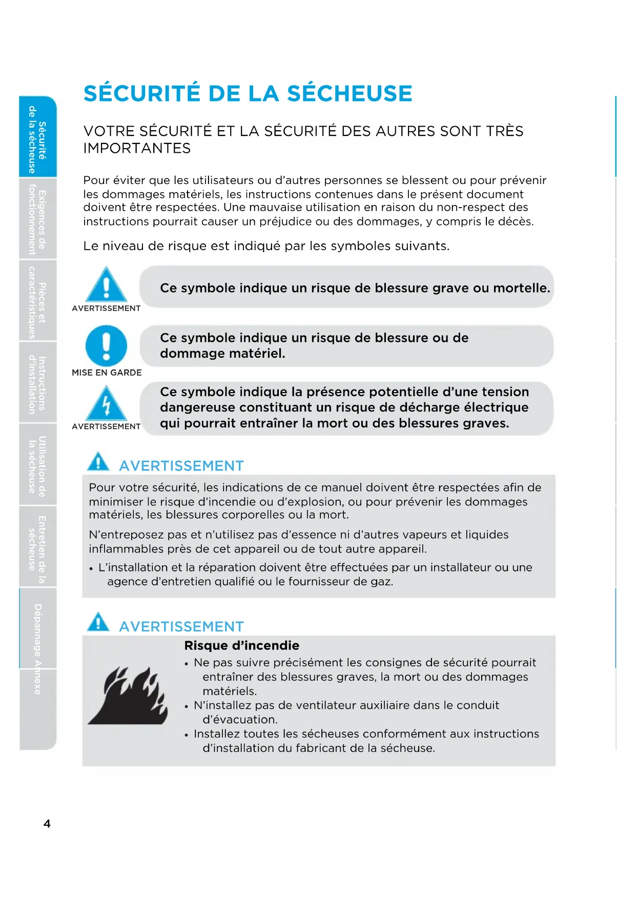 Ce symbole indique la présence potentielle d’une tension dangereuse constituant un risque de décharge électrique qui pourrait entraîner la mort ou des blessures graves. Ce symbole indique un risque de blessure grave ou mortelle. Ce symbole indique un risque de blessure ou de dommage matériel. Sécurité de la sécheuseExigences de fonctionnementPièces et caractéristiquesInstructions d’installationUtilisation de la sécheuseEntretien de la sécheuseDépannage Annexe Appendix5 Pour réduire le risque d’incendie, de choc électrique ou de blessure lors de l’utilisation de votre appareil, suivez les précautions de base, y compris ce qui suit: