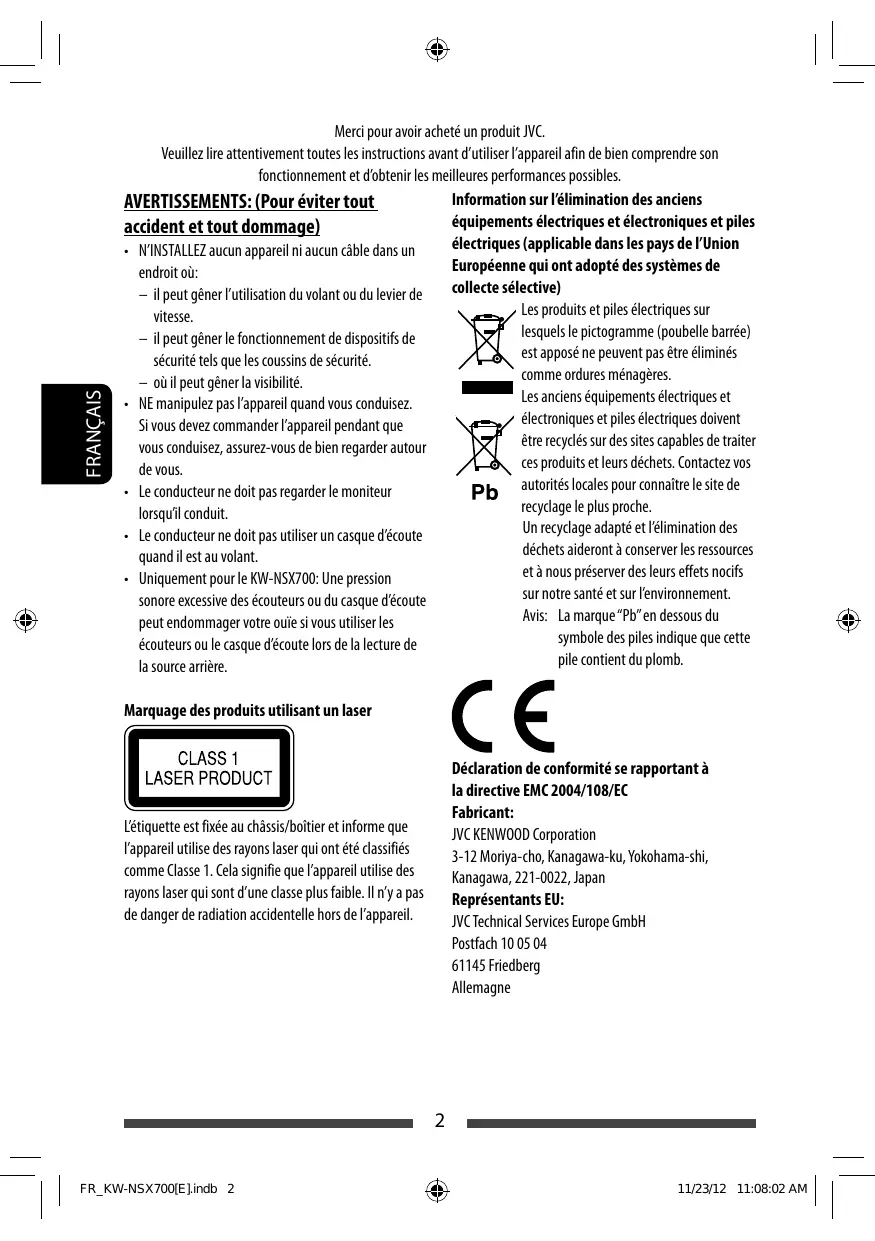 - Uniquement pour le KW-NSX700: Une pression sur notre santé et sur l’environnement. sonore excessive des écouteurs ou du casque d’écoute Avis: La marque “Pb” en dessous du peut endommager votre ouïe si vous utiliser les symbole des piles indique que cette écouteurs ou le casque d’écoute lors de la lecture de pile contient du plomb. la source arrière. Marquage des produits utilisant un laser Déclaration de conformité se rapportant à la directive EMC 2004/108/EC Fabricant: JVC KENWOOD Corporation 3-12 Moriya-cho, Kanagawa-ku, Yokohama-shi, Kanagawa, 221-0022, Japan Représentants EU: JVC Technical Services Europe GmbH Postfach 10 05 04 61145 Friedberg Allemagne L’étiquette est fixée au châssis/boîtier et informe que l’appareil utilise des rayons laser qui ont été classifiés comme Classe 1. Cela signifie que l’appareil utilise des rayons laser qui sont d’une classe plus faible. Il n’y a pas de danger de radiation accidentelle hors de l’appareil.