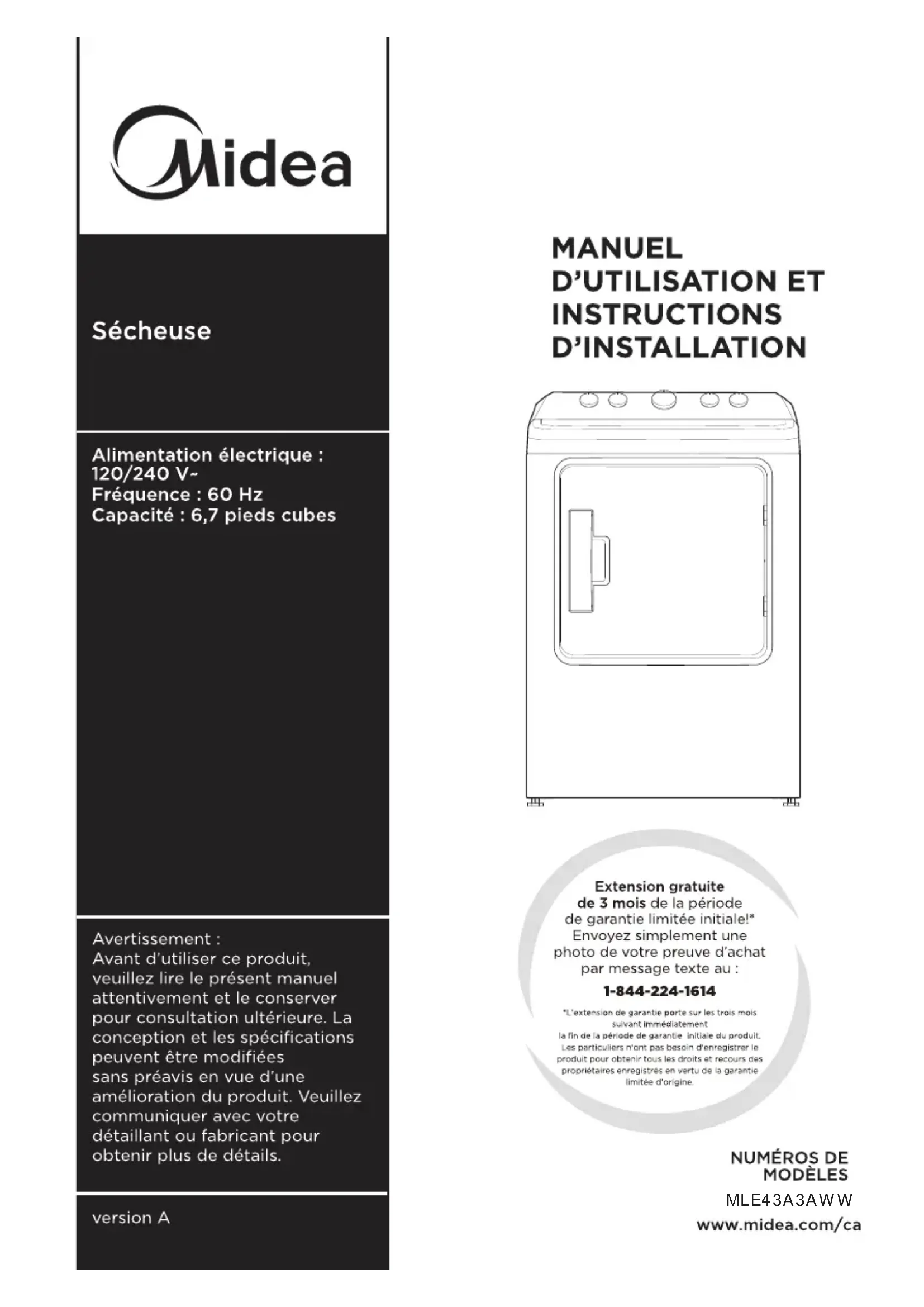 Retrouvez gratuitement la notice de l'appareil MLE43A3AWW MIDEA au format PDF.