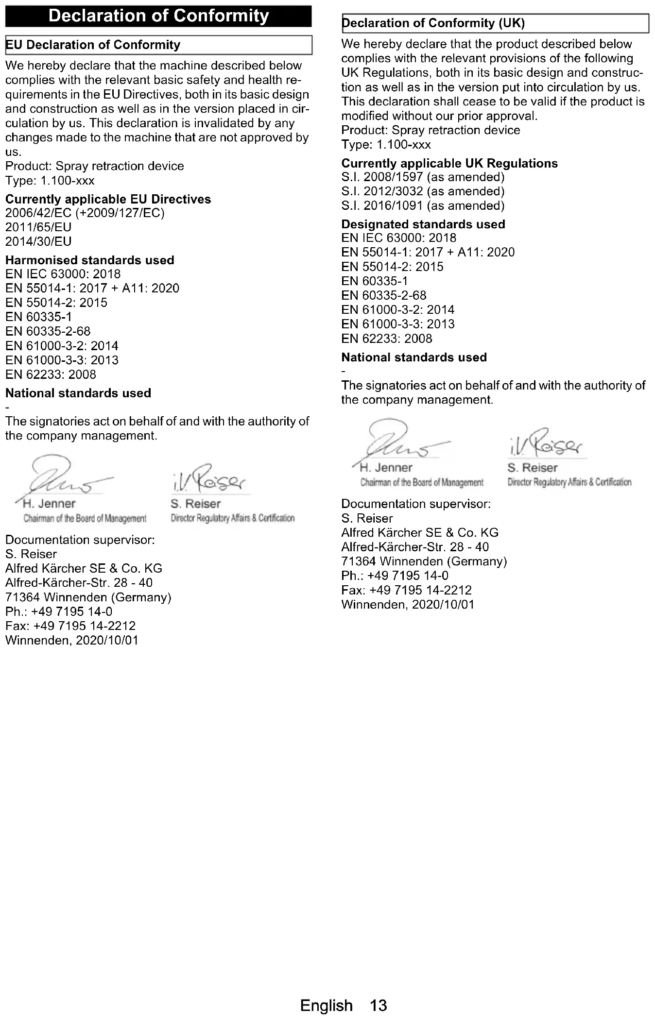 dans le réservoir d'eau sale. Service après-vente Si le défaut ne peut pas être éliminé, l’appareil doit être contrôlé par le service après-vente. Garantie Les conditions de garantie publiées par notre société commerciale compétente s'appliquent dans chaque pays. Nous remédions gratuitement aux défauts pos- sibles sur votre appareil dans la durée de garantie dans la mesure où la cause du défaut est un vice de matériau ou de fabrication. En cas de garantie, veuillez vous adresser à votre distributeur ou au point de service après-vente autorisé le plus proche avec la facture d'achat. (Voir l'adresse au dos) Accessoires et pièces de rechange Utiliser exclusivement des accessoires et pièces de re- change originaux. Ceux-ci garantissent le fonctionne- ment sûr et sans défaut de votre appareil. Des informations sur les accessoires et pièces de re- change sont disponibles sur le site Internet www.kaercher.com. Déclaration de conformité UE Nous déclarons par la présente que la machine dési- gnée ci-après ainsi que la version que nous avons mise en circulation, est conforme, de par sa conception et son type, aux exigences fondamentales de sécurité et de santé en vigueur des normes UE. Toute modification de la machine sans notre accord annule cette déclara- tion. Produit : appareil d'injection/extraction Type : 1.100-xxx Normes UE en vigueur 2006/42/CE (+2009/127/CE) 2011/65/EU 2014/30/UE Normes harmonisées appliquées EN IEC 63000: 2018 EN 55014-1: 2017 + A11: 2020 EN 55014-2: 2015 EN 60335-1 EN 60335-2-68 EN 61000-3-2: 2014 EN 61000-3-3: 2013 EN 62233: 2008 Normes nationales appliquées