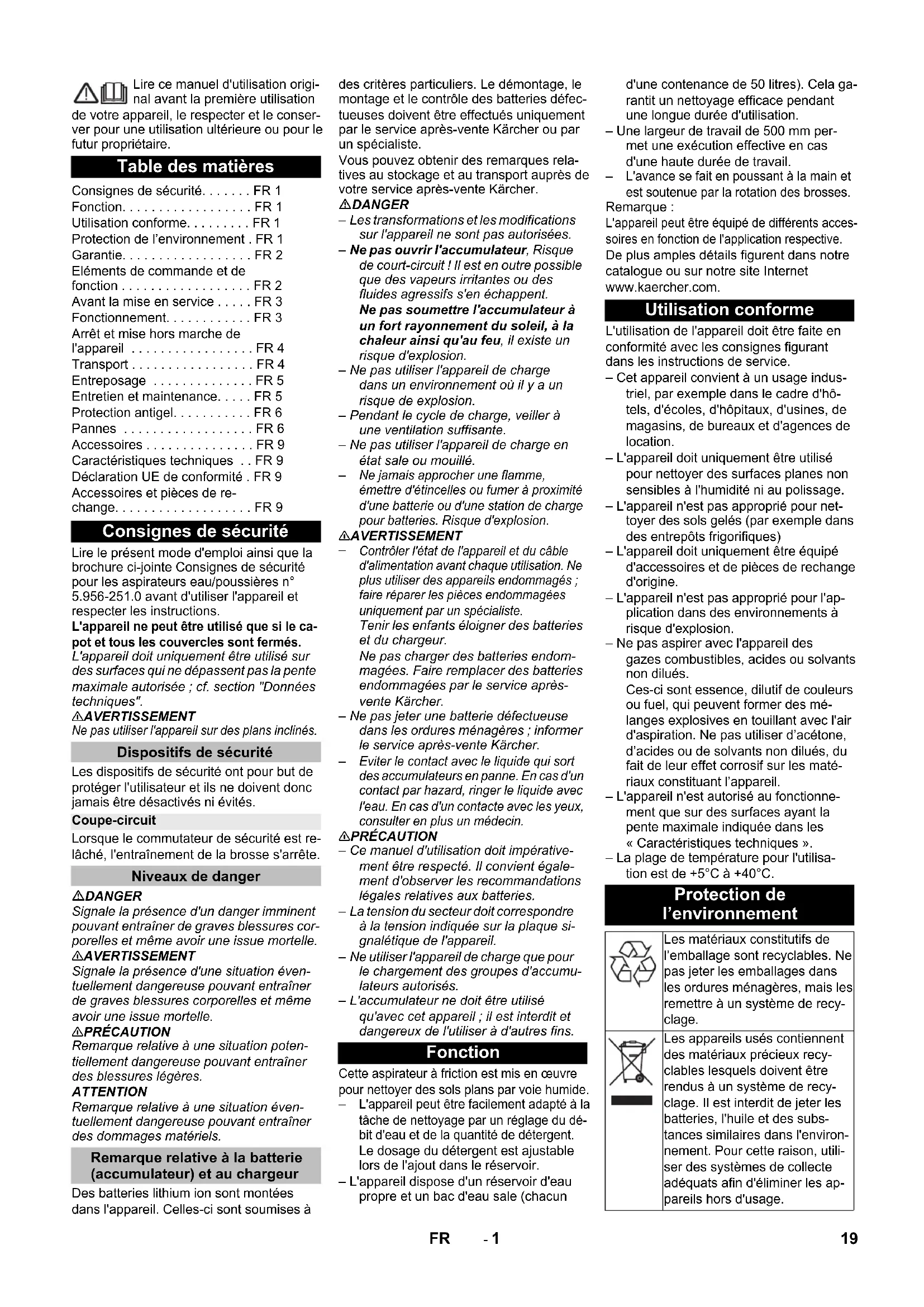 Accessories and Spare Parts Chairman of the Board of Management Director Regulatory Affairs & Certification 18 EN- 1 Lire ce manuel d'utilisation origi- nal avant la première utilisation de votre appareil, le respecter et le conser- ver pour une utilisation ultérieure ou pour le futur propriétaire. Lire le présent mode d'emploi ainsi que la brochure ci-jointe Consignes de sécurité pour les aspirateurs eau/poussières n° 5.956-251.0 avant d'utiliser l'appareil et respecter les instructions. L'appareil ne peut être utilisé que si le ca- pot et tous les couvercles sont fermés. L'appareil doit uniquement être utilisé sur des surfaces qui ne dépassent pas la pente maximale autorisée ; cf. section "Données techniques". 몇 AVERTISSEMENT Ne pas utiliser l'appareil sur des plans inclinés. Les dispositifs de sécurité ont pour but de protéger l'utilisateur et ils ne doivent donc jamais être désactivés ni évités. Lorsque le commutateur de sécurité est re- lâché, l'entraînement de la brosse s'arrête. DANGER Signale la présence d'un danger imminent pouvant entraîner de graves blessures cor- porelles et même avoir une issue mortelle. 몇 AVERTISSEMENT Signale la présence d'une situation éven- tuellement dangereuse pouvant entraîner de graves blessures corporelles et même avoir une issue mortelle. 몇 PRÉCAUTION Remarque relative à une situation poten- tiellement dangereuse pouvant entraîner des blessures légères. ATTENTION Remarque relative à une situation éven- tuellement dangereuse pouvant entraîner des dommages matériels. Des batteries lithium ion sont montées dans l'appareil. Celles-ci sont soumises à des critères particuliers. Le démontage, le montage et le contrôle des batteries défec- tueuses doivent être effectués uniquement par le service après-vente Kärcher ou par un spécialiste. Vous pouvez obtenir des remarques rela- tives au stockage et au transport auprès de votre service après-vente Kärcher. DANGER – Les transformations et les modifications sur l'appareil ne sont pas autorisées. – Ne pas ouvrir l'accumulateur, Risque de court-circuit ! Il est en outre possible que des vapeurs irritantes ou des fluides agressifs s'en échappent. Ne pas soumettre l'accumulateur à un fort rayonnement du soleil, à la chaleur ainsi qu'au feu, il existe un risque d'explosion. – Ne pas utiliser l'appareil de charge dans un environnement où il y a un risque de explosion. – Pendant le cycle de charge, veiller à une ventilation suffisante. – Ne pas utiliser l'appareil de charge en état sale ou mouillé.