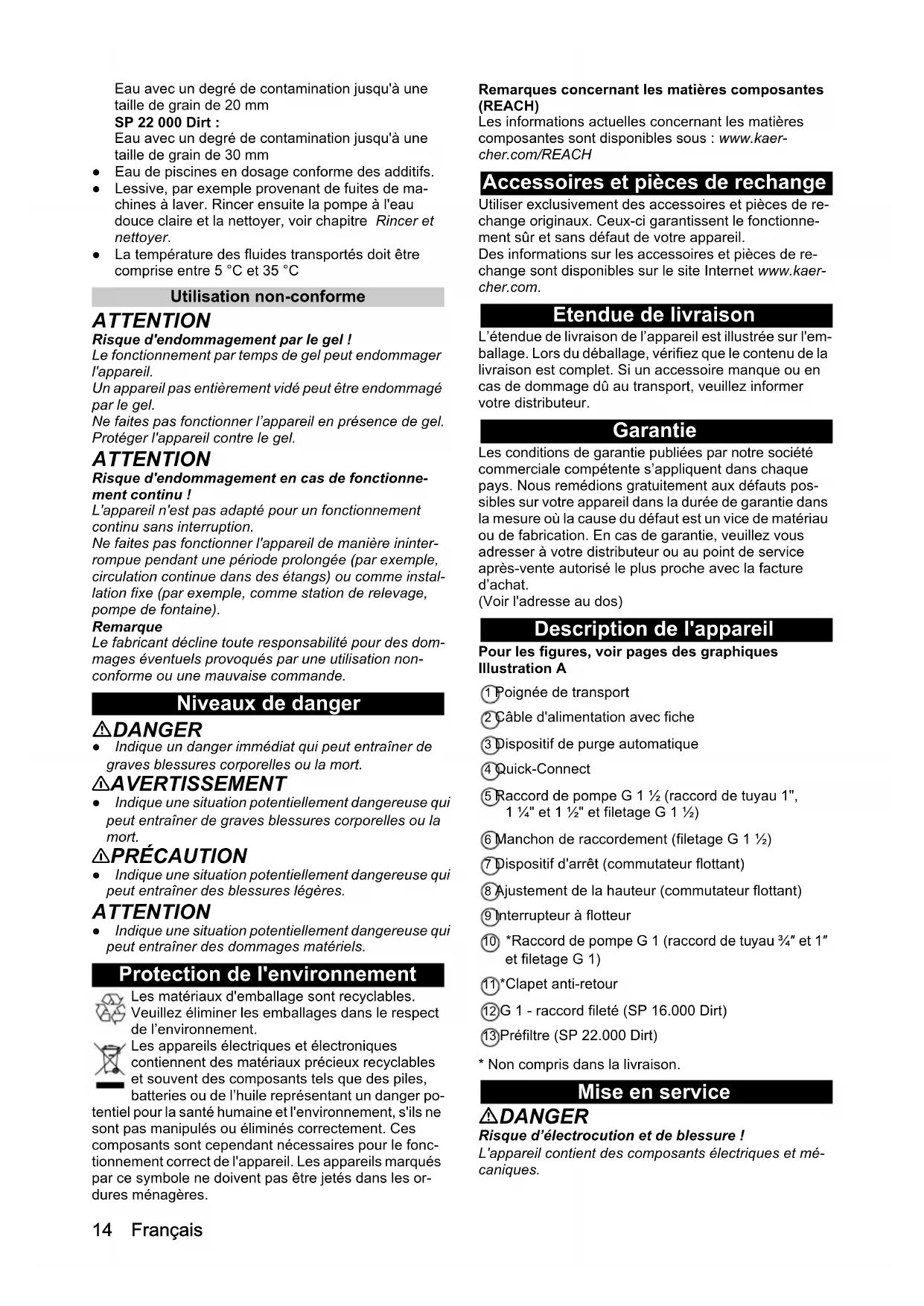 - Déclaration de conformité UE Français Eau avec un degré de contamination jusqu'à une taille de grain de 20 mm SP 22 000 Dirt : Eau avec un degré de contamination jusqu'à une taille de grain de 30 mm ● Eau de piscines en dosage conforme des additifs. ● Lessive, par exemple provenant de fuites de ma- chines à laver. Rincer ensuite la pompe à l'eau douce claire et la nettoyer, voir chapitre Rincer et nettoyer. ● La température des fluides transportés doit être comprise entre 5 °C et 35 °C Utilisation non-conforme ATTENTION Risque d'endommagement par le gel ! Le fonctionnement par temps de gel peut endommager l'appareil. Un appareil pas entièrement vidé peut être endommagé par le gel. Ne faites pas fonctionner l’appareil en présence de gel. Protéger l'appareil contre le gel. ATTENTION Risque d'endommagement en cas de fonctionne- ment continu ! L'appareil n'est pas adapté pour un fonctionnement continu sans interruption. Ne faites pas fonctionner l'appareil de manière ininter- rompue pendant une période prolongée (par exemple, circulation continue dans des étangs) ou comme instal- lation fixe (par exemple, comme station de relevage, pompe de fontaine). Remarque Le fabricant décline toute responsabilité pour des dom- mages éventuels provoqués par une utilisation non- conforme ou une mauvaise commande. Niveaux de danger DANGER ● Indique un danger immédiat qui peut entraîner de graves blessures corporelles ou la mort. 몇 AVERTISSEMENT ● Indique une situation potentiellement dangereuse qui peut entraîner de graves blessures corporelles ou la mort. 몇 PRÉCAUTION ● Indique une situation potentiellement dangereuse qui peut entraîner des blessures légères. ATTENTION ● Indique une situation potentiellement dangereuse qui peut entraîner des dommages matériels. Protection de l'environnement Les matériaux d'emballage sont recyclables. Veuillez éliminer les emballages dans le respect de l’environnement. Les appareils électriques et électroniques contiennent des matériaux précieux recyclables et souvent des composants tels que des piles, batteries ou de l’huile représentant un danger po- tentiel pour la santé humaine et l'environnement, s'ils ne sont pas manipulés ou éliminés correctement. Ces composants sont cependant nécessaires pour le fonc- tionnement correct de l'appareil. Les appareils marqués par ce symbole ne doivent pas être jetés dans les or- dures ménagères. Remarques concernant les matières composantes (REACH) Les informations actuelles concernant les matières composantes sont disponibles sous : www.kaer- cher.com/REACH Accessoires et pièces de rechange Utiliser exclusivement des accessoires et pièces de re- change originaux. Ceux-ci garantissent le fonctionne- ment sûr et sans défaut de votre appareil. Des informations sur les accessoires et pièces de re- change sont disponibles sur le site Internet www.kaer- cher.com. Etendue de livraison L’étendue de livraison de l’appareil est illustrée sur l'em- ballage. Lors du déballage, vérifiez que le contenu de la livraison est complet. Si un accessoire manque ou en cas de dommage dû au transport, veuillez informer votre distributeur. Garantie Les conditions de garantie publiées par notre société commerciale compétente s’appliquent dans chaque pays. Nous remédions gratuitement aux défauts pos- sibles sur votre appareil dans la durée de garantie dans la mesure où la cause du défaut est un vice de matériau ou de fabrication. En cas de garantie, veuillez vous adresser à votre distributeur ou au point de service après-vente autorisé le plus proche avec la facture d’achat. (Voir l'adresse au dos) Description de l'appareil Pour les figures, voir pages des graphiques Illustration A 1 Poignée de transport 2 Câble d'alimentation avec fiche 3 Dispositif de purge automatique 4 Quick-Connect 5 Raccord de pompe G 1 ½ (raccord de tuyau 1", 1 ¼" et 1 ½" et filetage G 1 ½) 6 Manchon de raccordement (filetage G 1 ½) 7 Dispositif d'arrêt (commutateur flottant) 8 Ajustement de la hauteur (commutateur flottant) 9 Interrupteur à flotteur 10 *Raccord de pompe G 1 (raccord de tuyau ¾″ et 1″ et filetage G 1) 11 *Clapet anti-retour 12 G 1 - raccord fileté (SP 16.000 Dirt) 13 Préfiltre (SP 22.000 Dirt) p. 1814